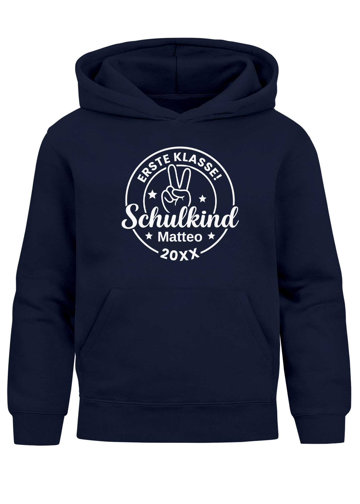 - Vom Kindergarten direkt in die „erste Liga“ – die 1. Klasse! Mit diesem Hoodie und dem lässigen Peace- bzw Schultüten-Motiv wird der Schulstart nicht nur spannend, sondern auch richtig fotogen. Unter "Jetzt anpassen" mit Wunschjahr und Name personalisierbar