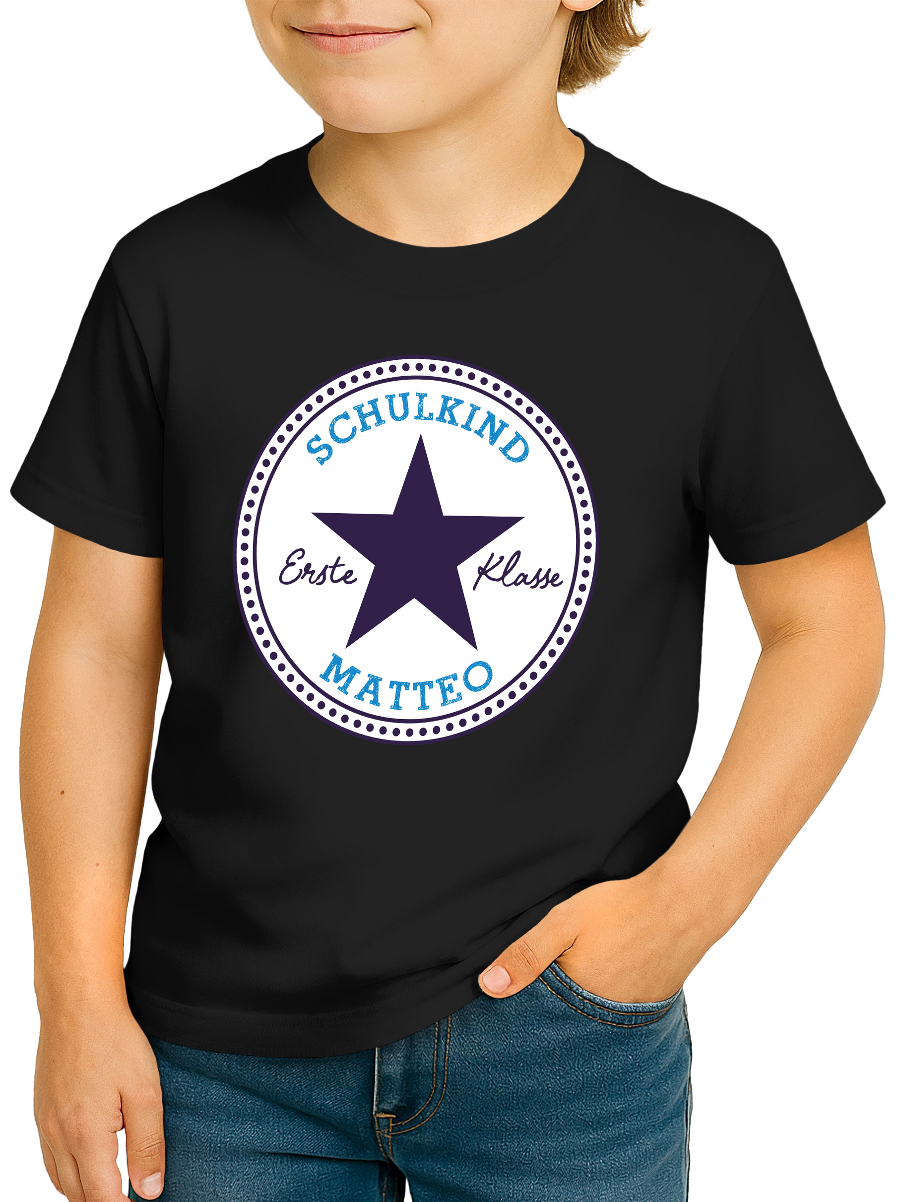 • Ein echter Star am 1. Schultag – mit einem personalisierten Einschulungs-Shirt. Mit dem auffälligen Stern-Motiv, dem Namen des Schulkindes und der Aufschrift „Erste Klasse“ wird dieses T-Shirt zur Einschulung 2026 zum echten Lieblingsstück. Perfekt als Geschenkidee für stolze Erstklässler