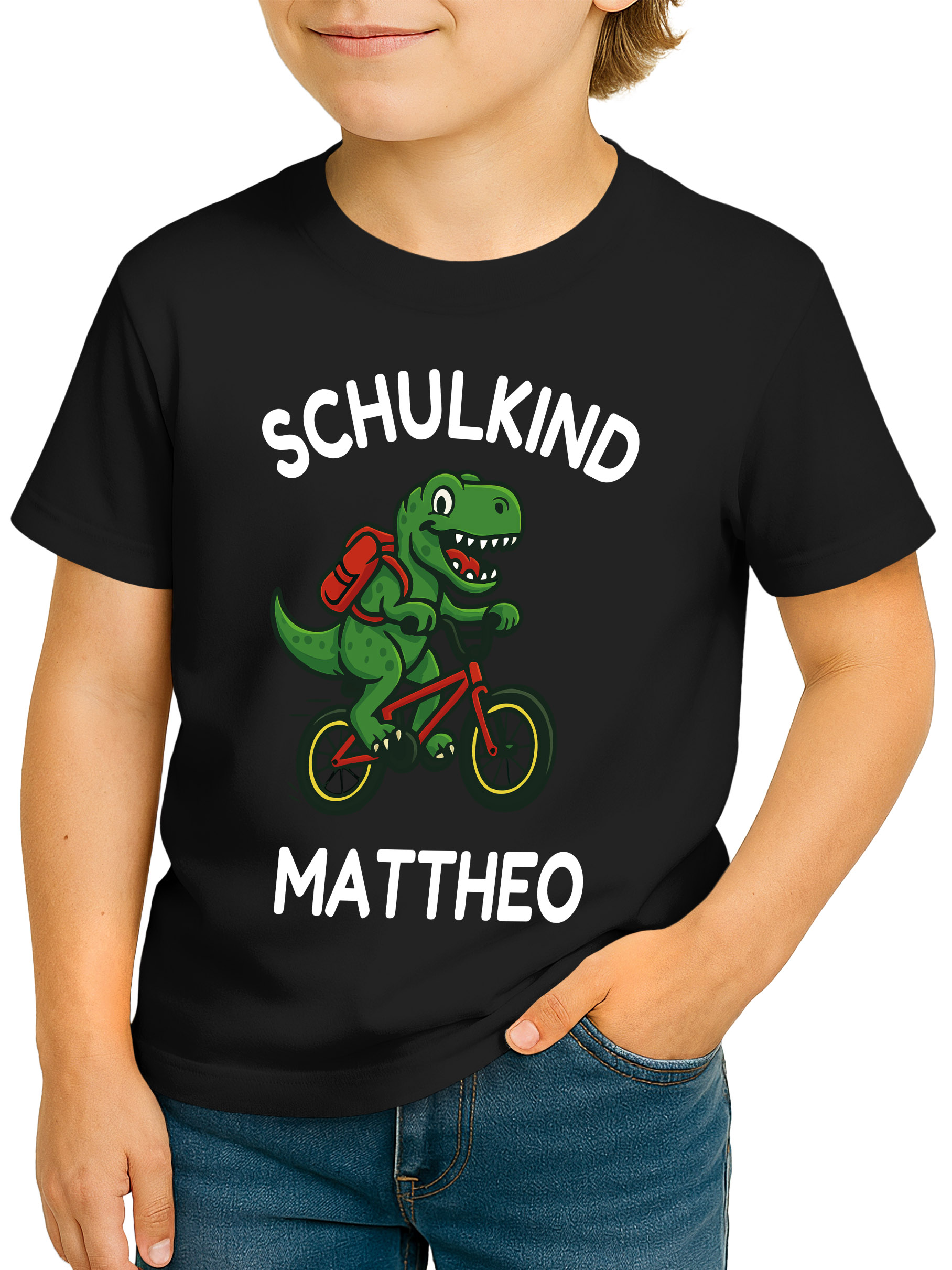 • Dino on Tour – mit Schwung in die 1. Klasse. Mit dem sportlichen Dino-Motiv, Namensaufdruck und Schulkind-Schriftzug ist dieses Einschulungs-T-Shirt ideal für kleine Radler. Ein cooles Outfit für den ersten Schultag und ein unvergessliches Andenken