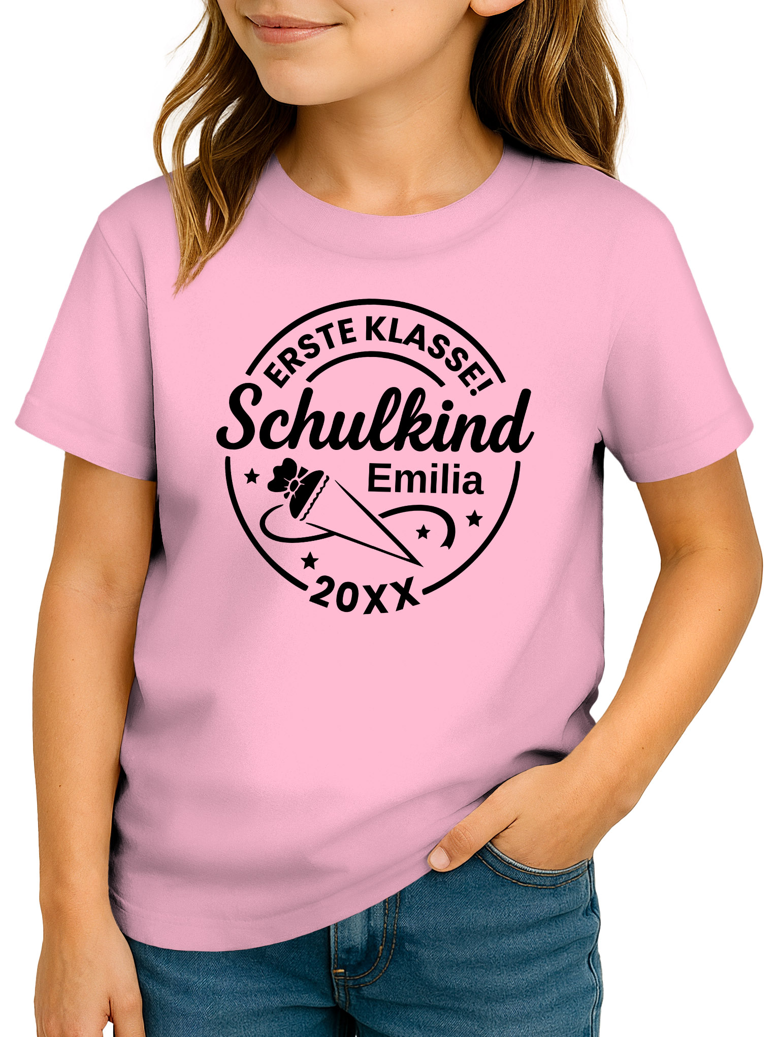 Kinder Mädchen T-Shirt Einschulung Erste Klasse personalisiert Schulkind 2026 mit Wunschname Schulanfang Geschenkidee Moonworks®