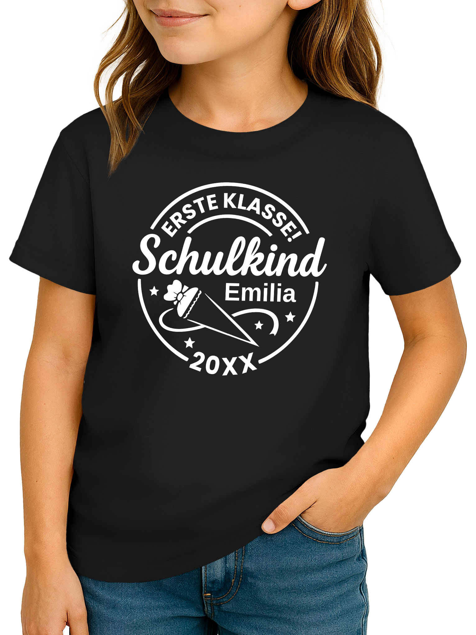 Kinder Mädchen T-Shirt Einschulung Erste Klasse personalisiert Schulkind 2026 mit Wunschname Schulanfang Geschenkidee Moonworks®
