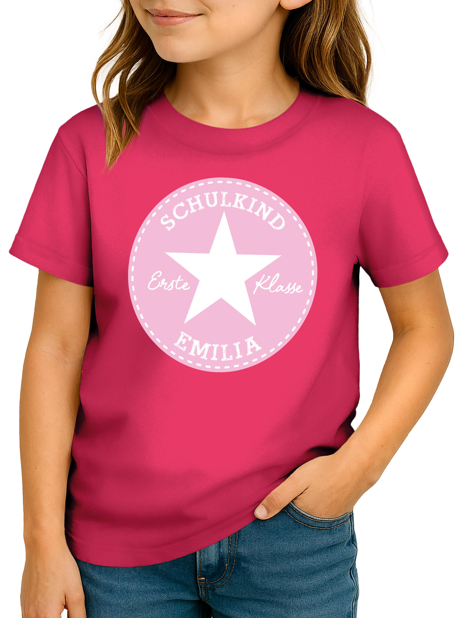 - Ein echter Star am 1. Schultag – personalisiertes Einschulungs-Shirt. Mit dem auffälligen Stern-Motiv, dem Namen des Schulkindes und der Aufschrift „Erste Klasse“ wird dieses T-Shirt zur Einschulung 2026 zum echten Lieblingsstück. Perfekt als Geschenkidee für stolze Erstklässlerinnen