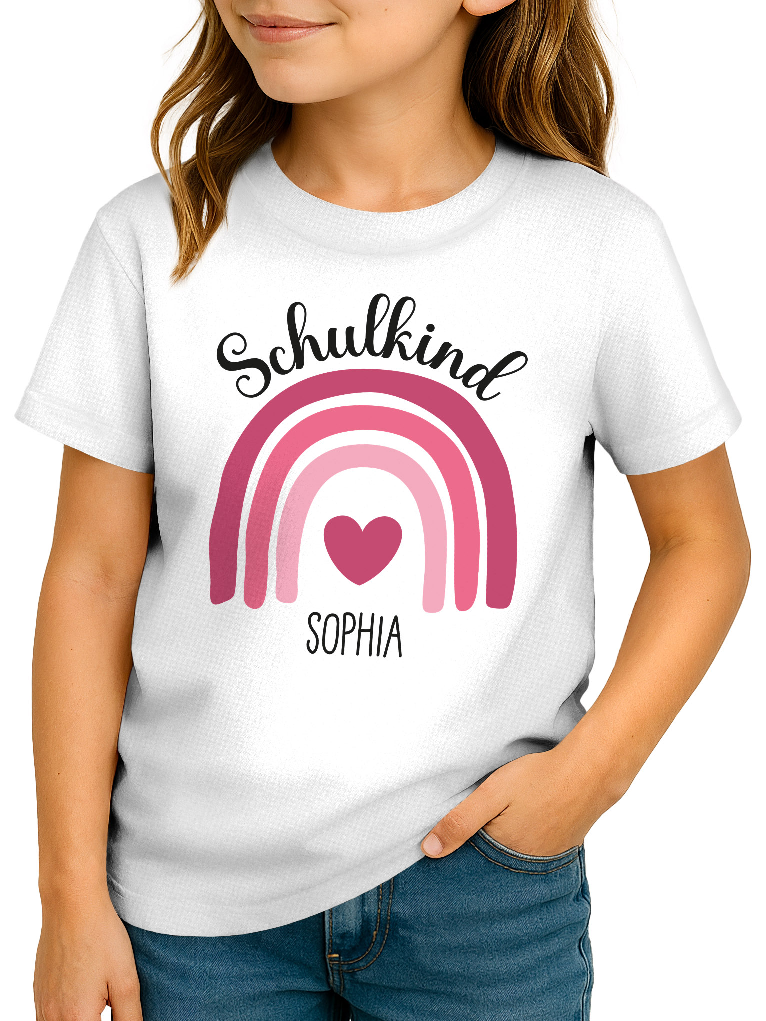 - Dieses liebevoll gestaltete T-Shirt zur Einschulung 2026 mit modernem Regenbogen-Design, Herzsymbol und deinem Wunschnamen ist das perfekte Outfit für stolze Schulanfängerinnen. Ideal für die 1. Klasse, Einschulungsfeier & Erinnerungsfotos