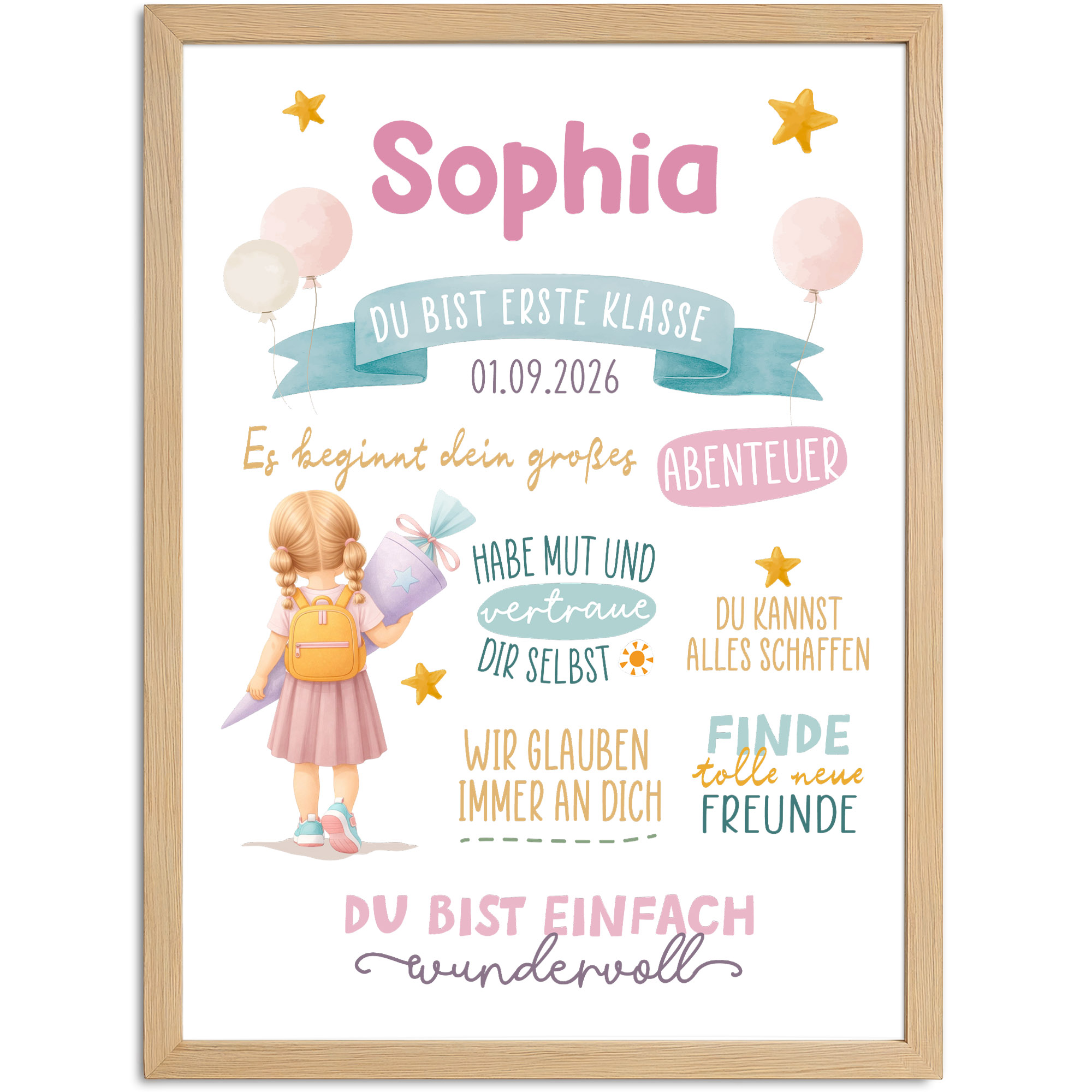 - Mit Liebe personalisiert – Dieses zauberhafte Einschulungsposter wird mit dem Namen deines Kindes personalisiert und ist in einer Variante für Mädchen oder Jungen erhältlich. Ein einzigartiges Geschenk zum ersten Schultag und eine bleibende Erinnerung für kleine Schulanfänger