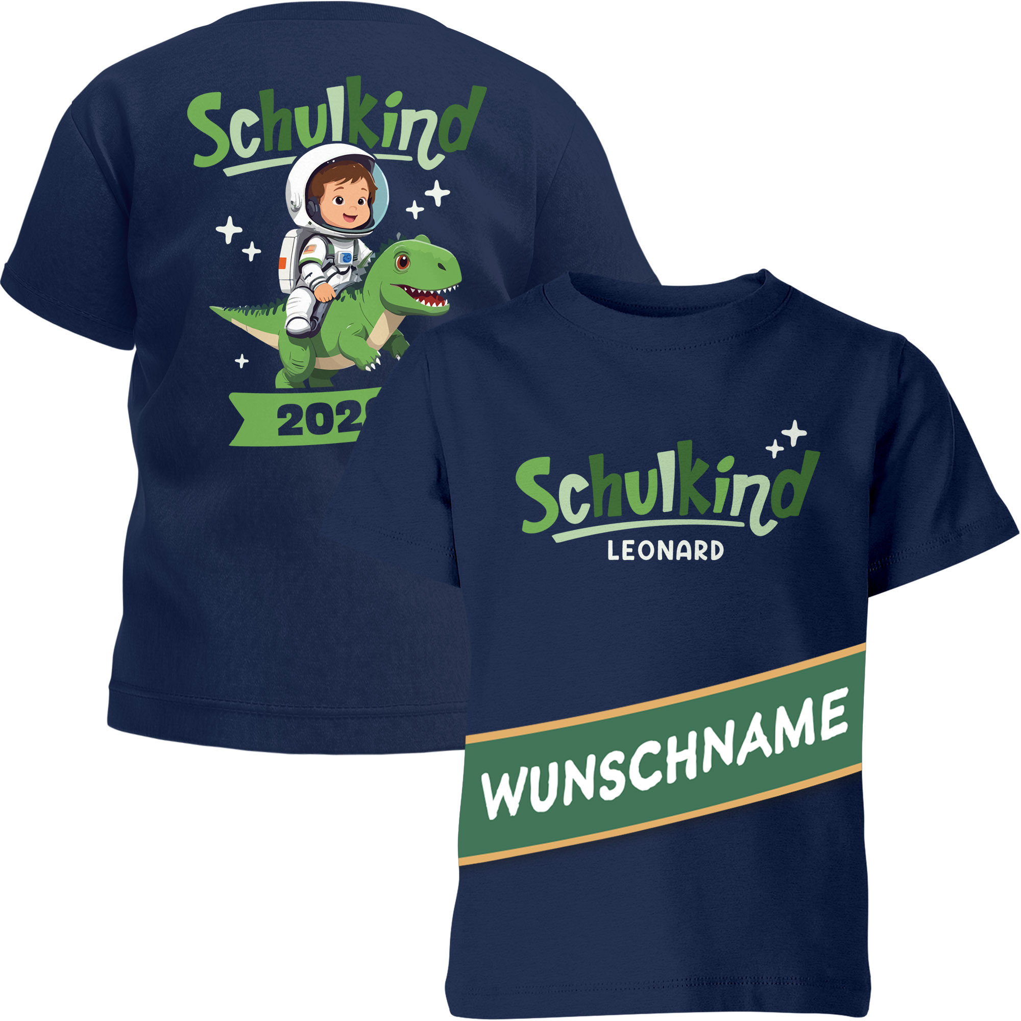 • Motiv: Kleiner Astronaut auf Dinosaurier - anpassbar mit Wunschnamen und 2026 Jahreszahl, ebenfalls anpassbar