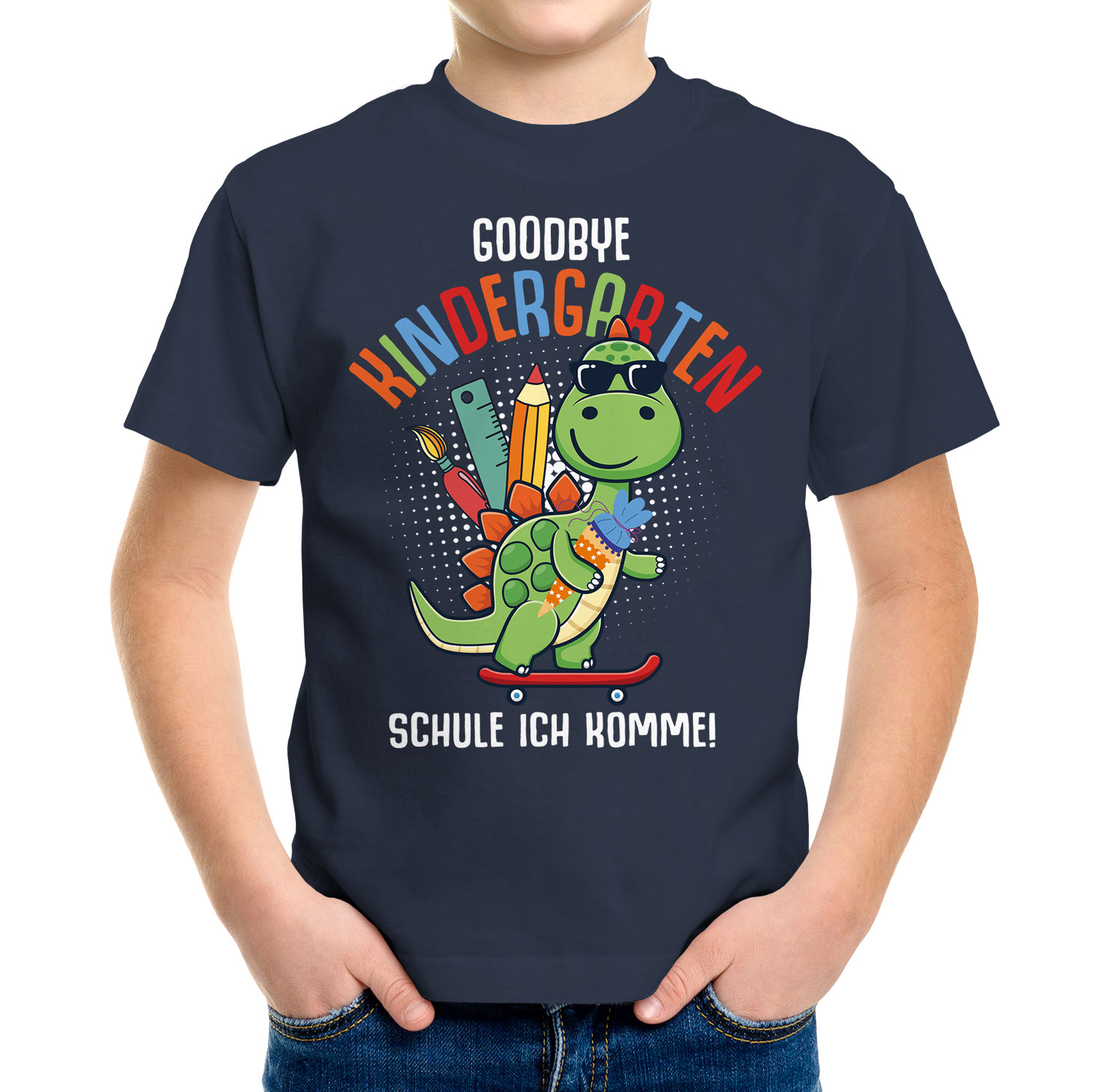 - Lustiges Einschulungs-Shirt für kleine Jungs und Mädels. Das Motiv mit coolem Dino auf Skateboard und Spruch "Goodbye Kindergarten - Schule ich komme" ist das perfekte Outfit für den ersten Schultag