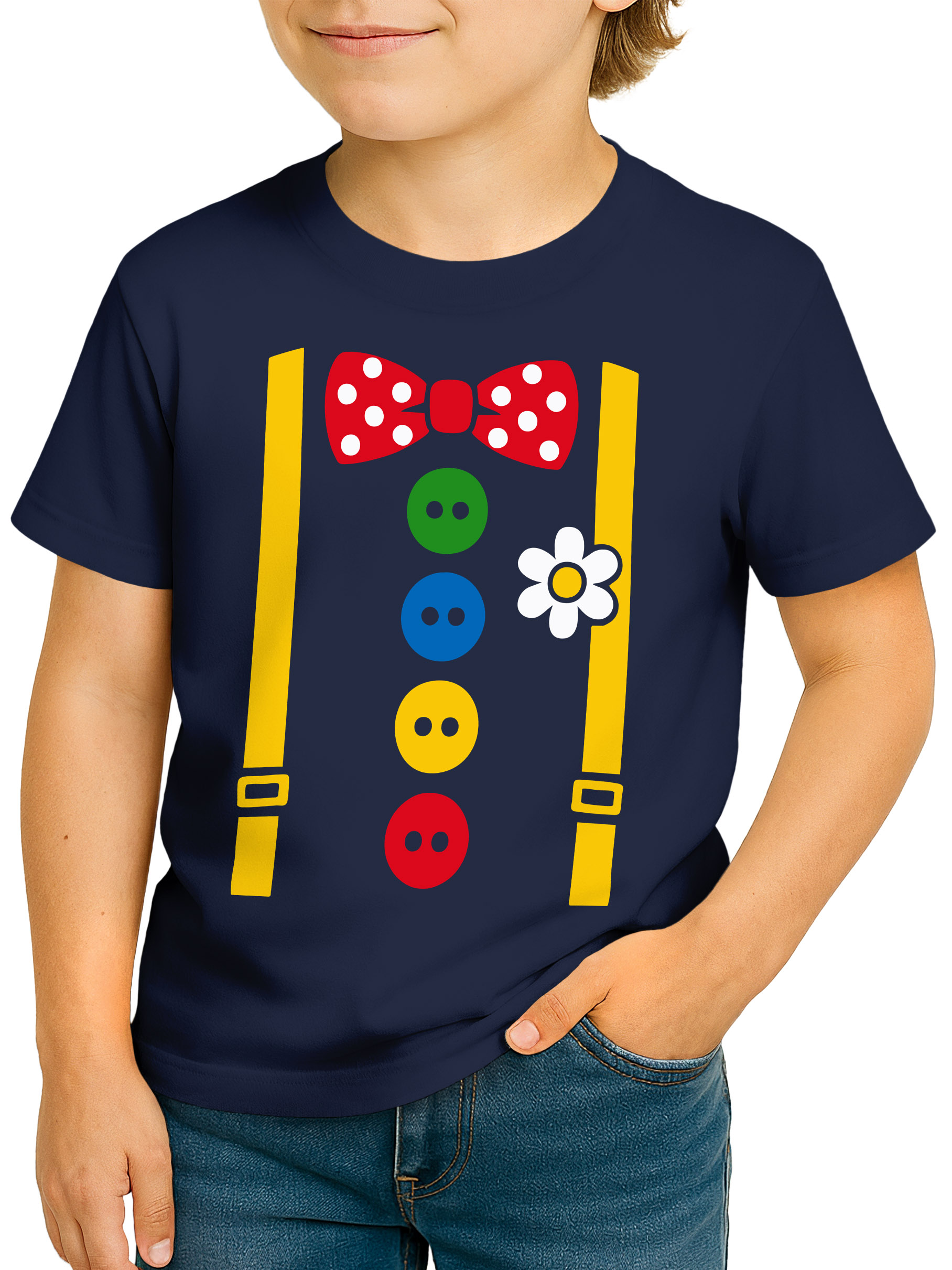 • Faschings T-Shirt für Jungen mit Clown-Hosenträger- und Knopfdesign – einfache Verkleidung für Karneval, Kinderfasching, Schule oder Kindergarten. Mit passenden Accessoires ist das Shirt auch als Oberteil eines niedlichen DIY-Kostüm eine gute Idee für eine einfache Verkleidung