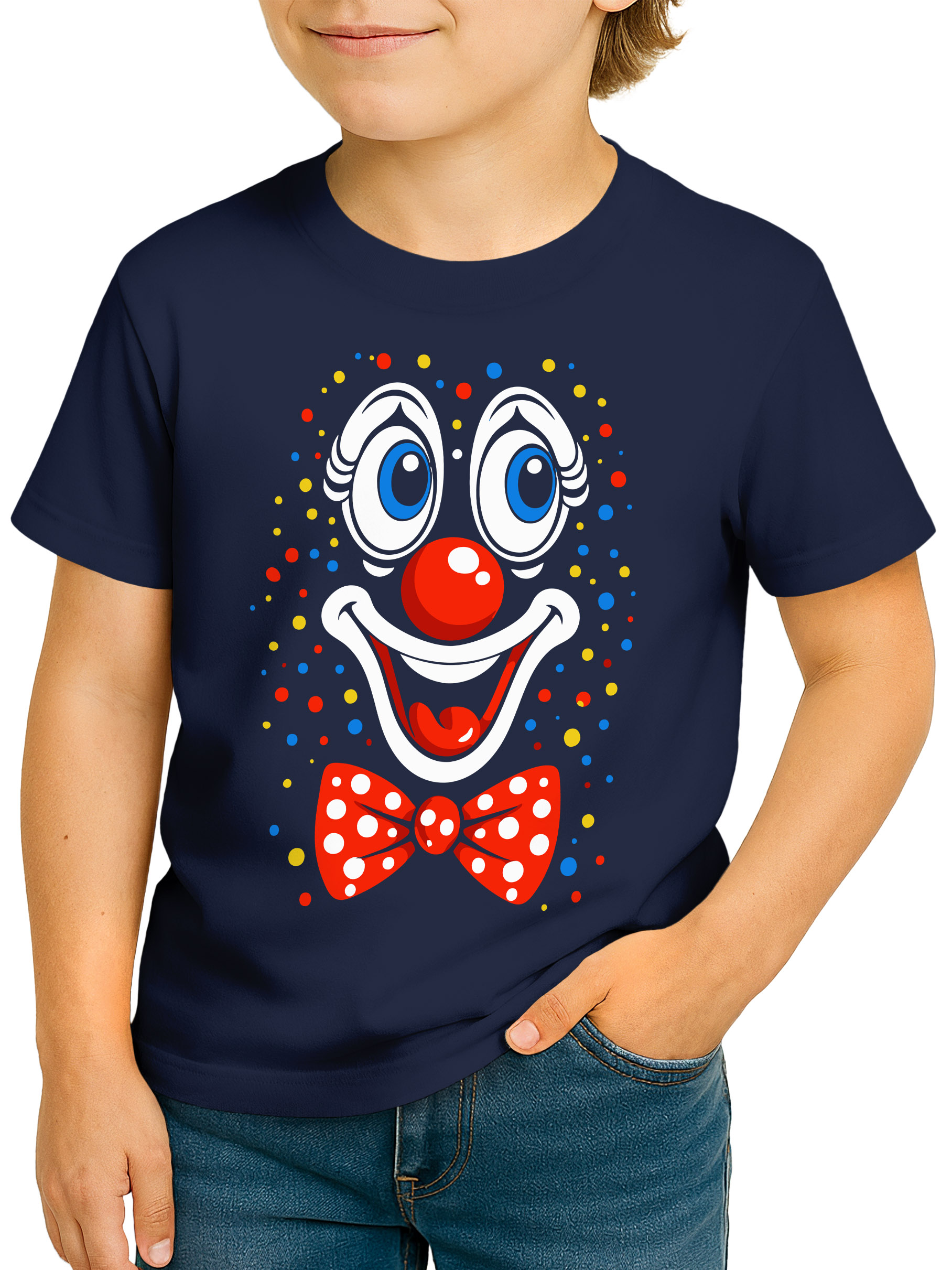 • Kinder T-Shirt mit fröhlichem Clownsgesicht und bunter Fliege – auffälliges Faschingsmotiv für Jungen, ideal für Karneval, Umzug und Mottopartys.Mit passenden Accessoires ist das Shirt auch als Oberteil eines niedlichen DIY-Kostüm eine gute Idee für eine einfache Verkleidung