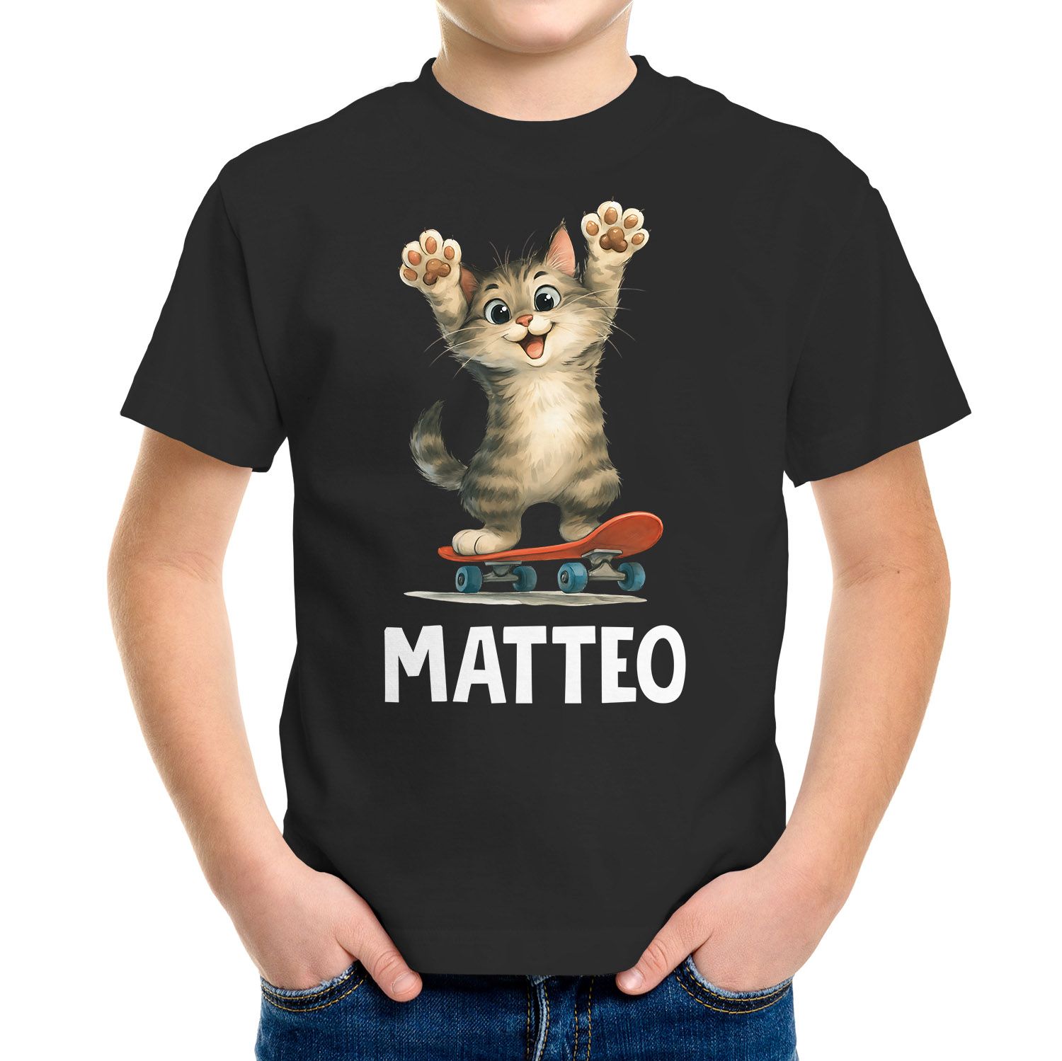Kinder T-Shirt Katze mit Name – personalisiertes Shirt für Jungen – Lustiges Skateboard-Motiv – Geschenk zum Geburtstag oder Schule Moonworks®