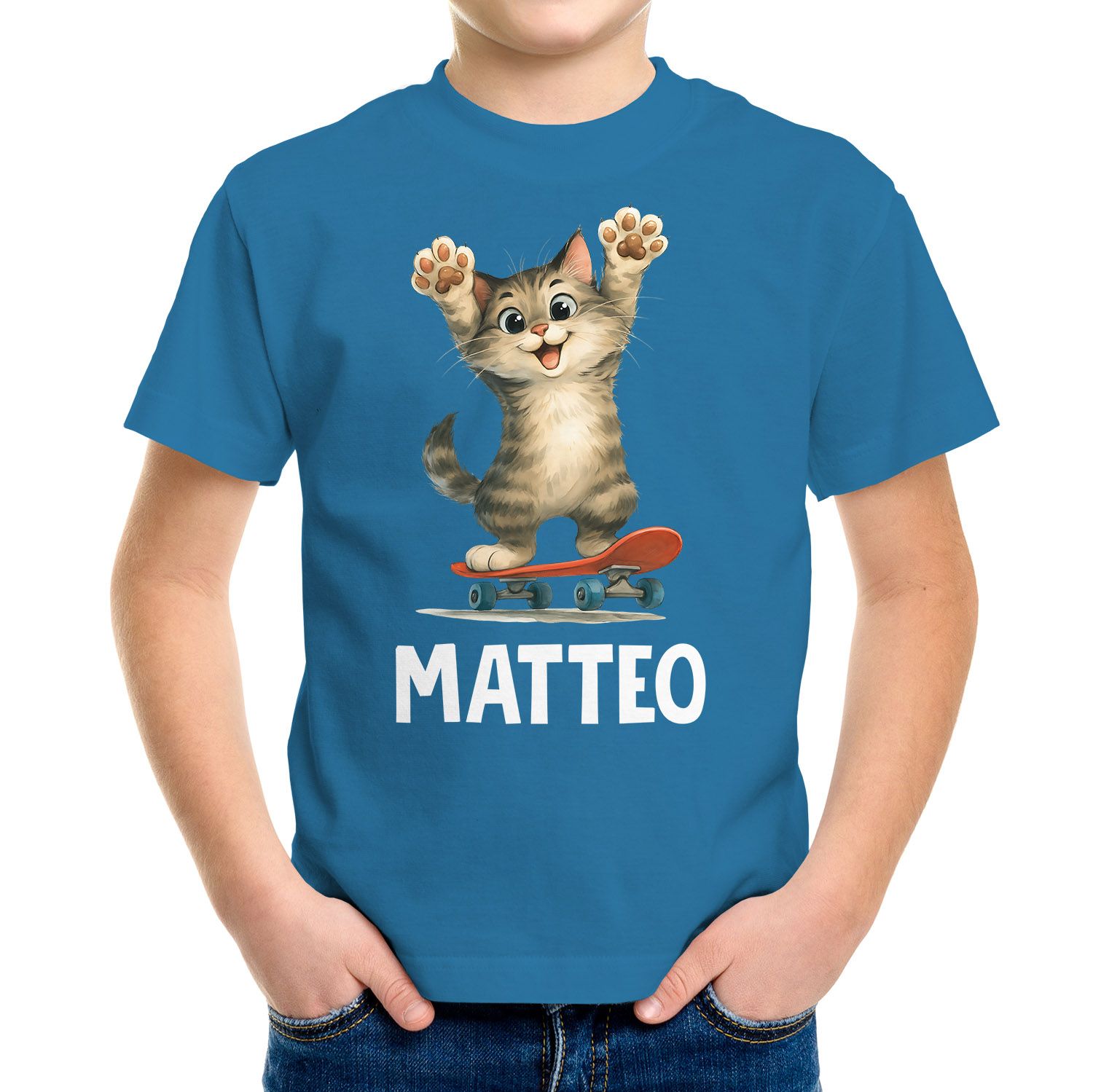 Kinder T-Shirt Katze mit Name – personalisiertes Shirt für Jungen – Lustiges Skateboard-Motiv – Geschenk zum Geburtstag oder Schule Moonworks®