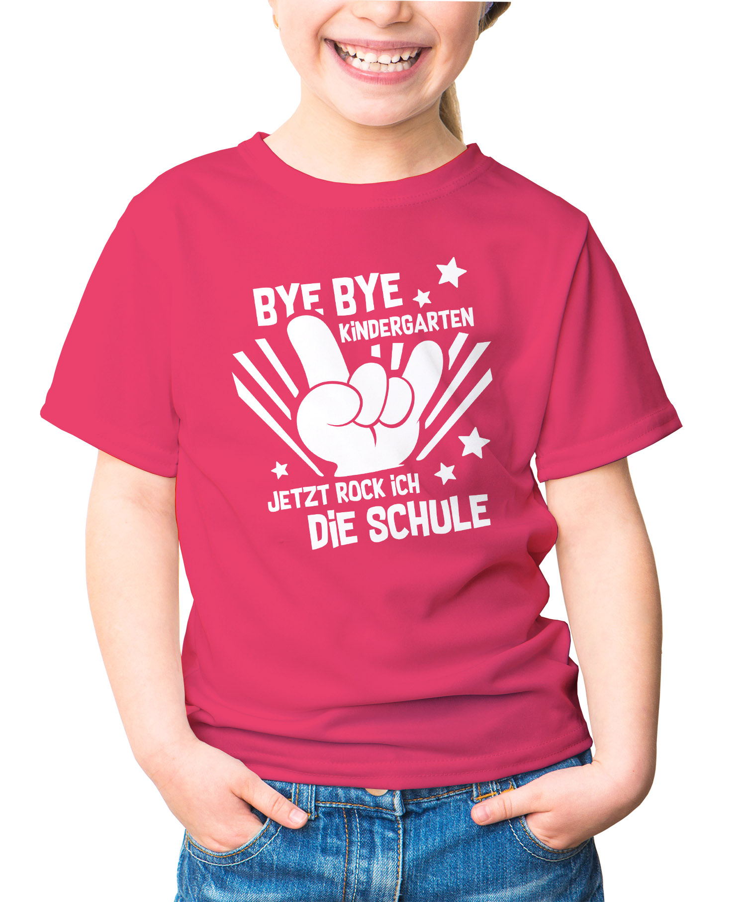 - Motiv: lustiger Spruch "Bye Bye Kindergarten, jetzt rock ich die Schule, Comic-Hand, Sterne, Metalhand
