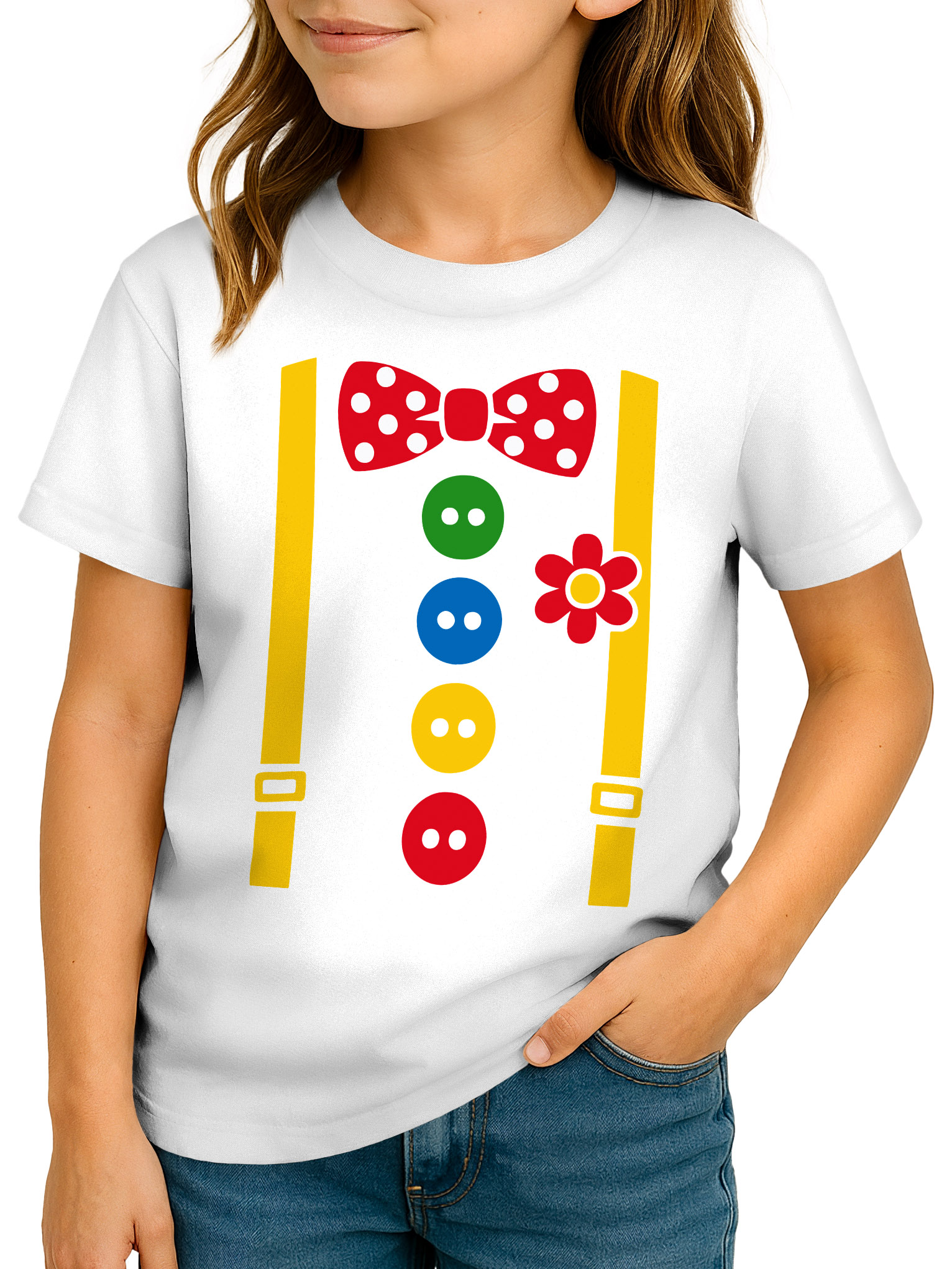 • Faschings-Shirt für Mädchen im Clown-Outfit-Look mit Fliege, Knöpfen und Hosenträgern – einfache Kostüm-Alternative für Karneval, Schulfeiern und Kinderpartys. Mit passenden Accessoires ist das Shirt auch als Oberteil eines niedlichen DIY-Kostüm eine kreative Idee für einfache Verkleidung