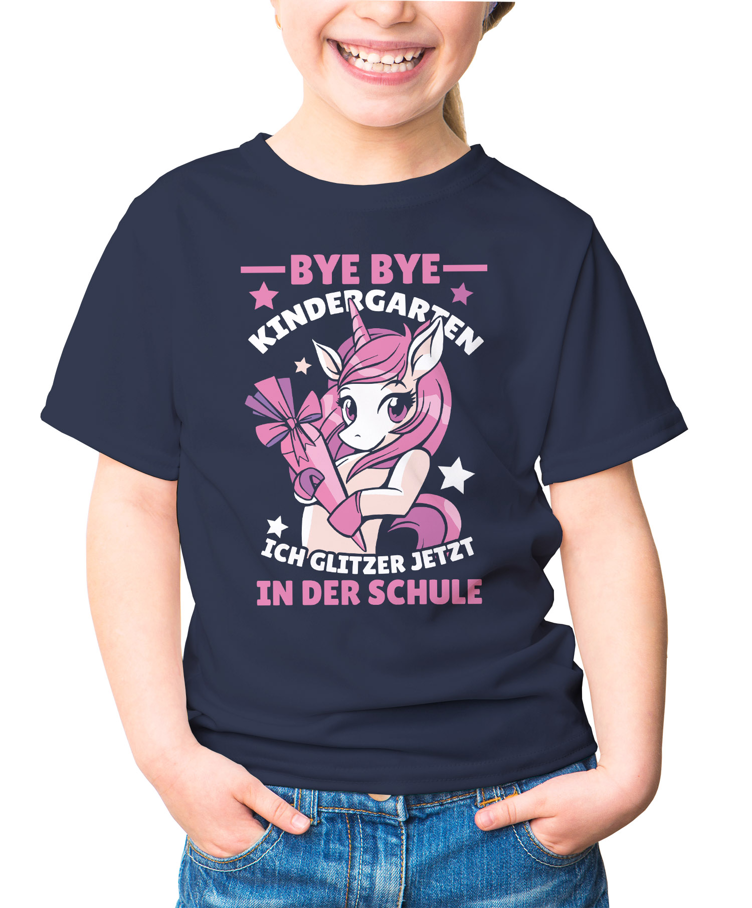 - Cooles T-Shirt Geschenk für Mädchen zur Einschulung mit Einhorn Motiv und Spruch "Bye Bye Kindergarten, ich glitzer jetzt in der Schule"
