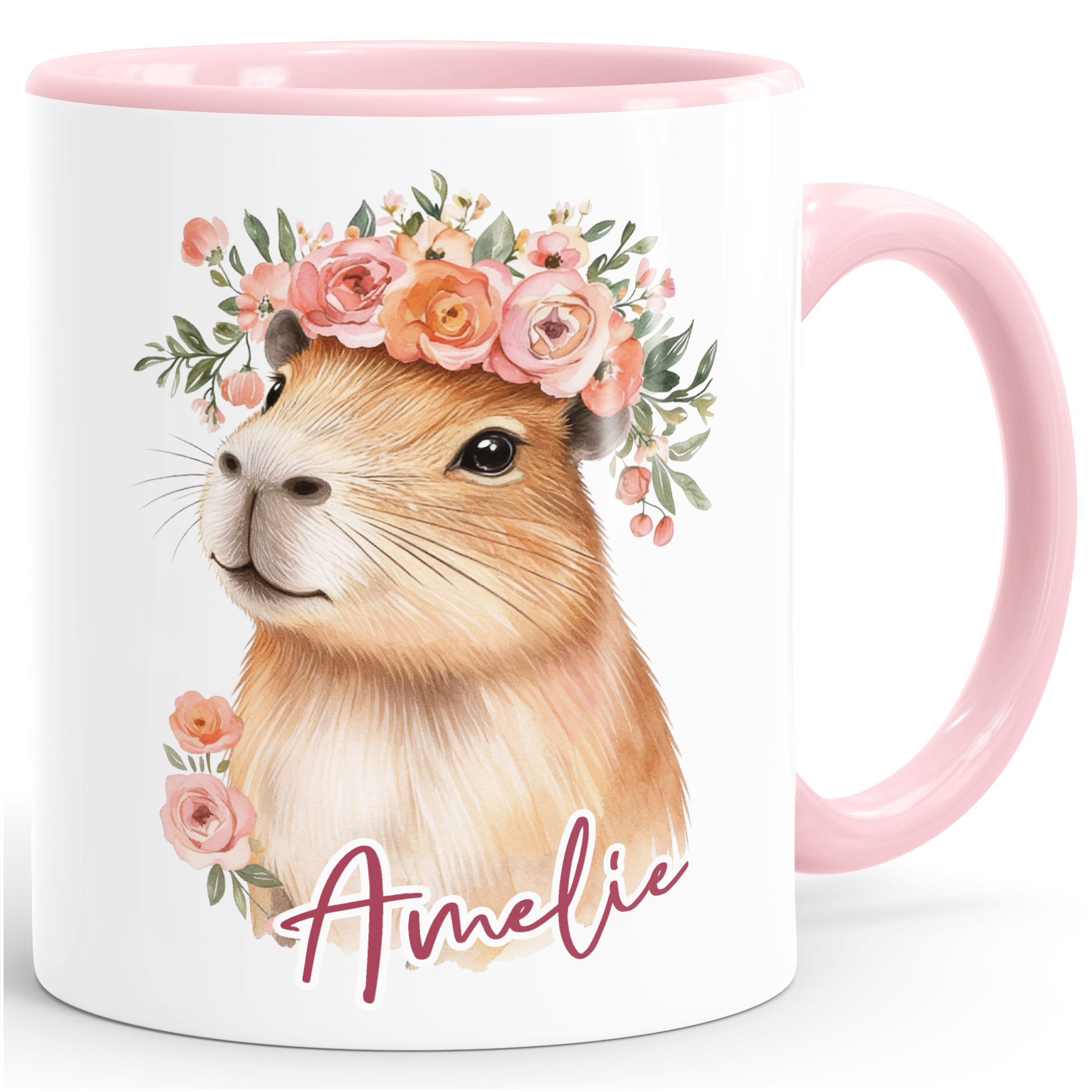 Kindertasse personalisiert mit Name Capybara Blumenkranz Wasserschwein Aufdruck für Kinder Mädchen SpecialMe®