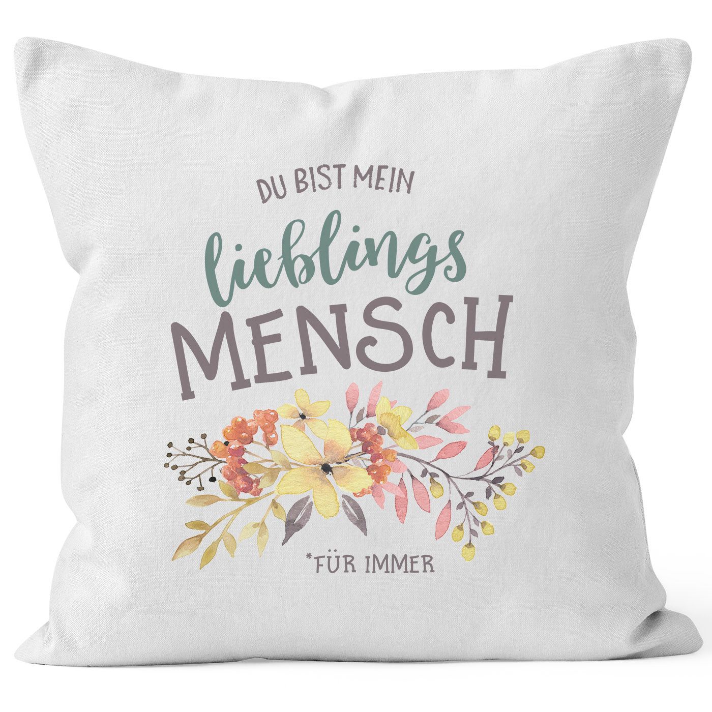 - wunderschönr Kissenbezug mit "Du bist mein Lieblingsmensch" Spruch und Blumen Print im Watercolor Stil der Marke Moonworks®.