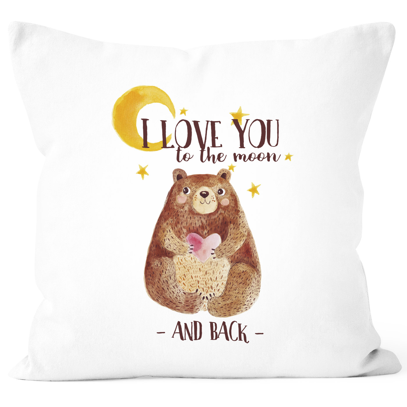 - zauberhaftes Geschenk für einen geliebten Menschen: Kissen-Bezug mit süßem Bär mit Herz Motiv im Watercolor Stil und "Ich liebe dich bis zum Mond und wieder zurück" Schriftzug aus der aktuellen Moonworks® Kollektion