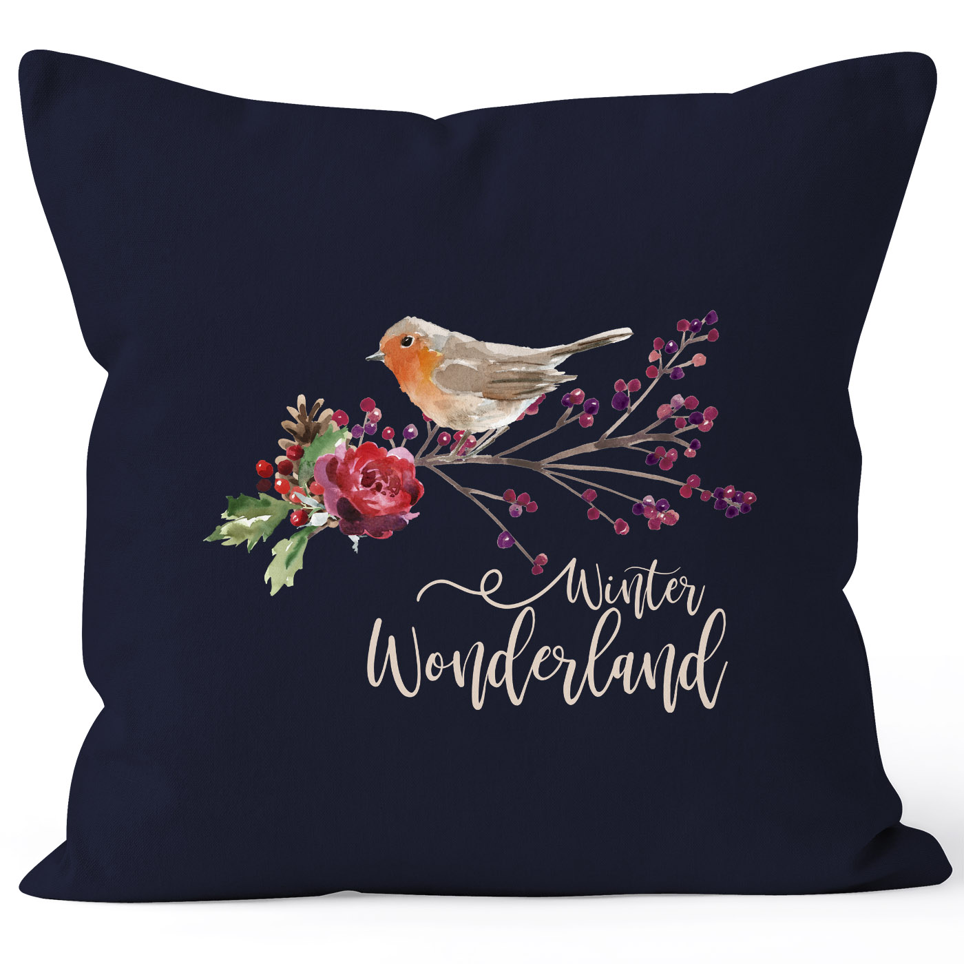 Kissenbezug Weihnachten Winterwonderland Vogel Rotkehlchen Blumen Misteln Christmas Bird Autiga®