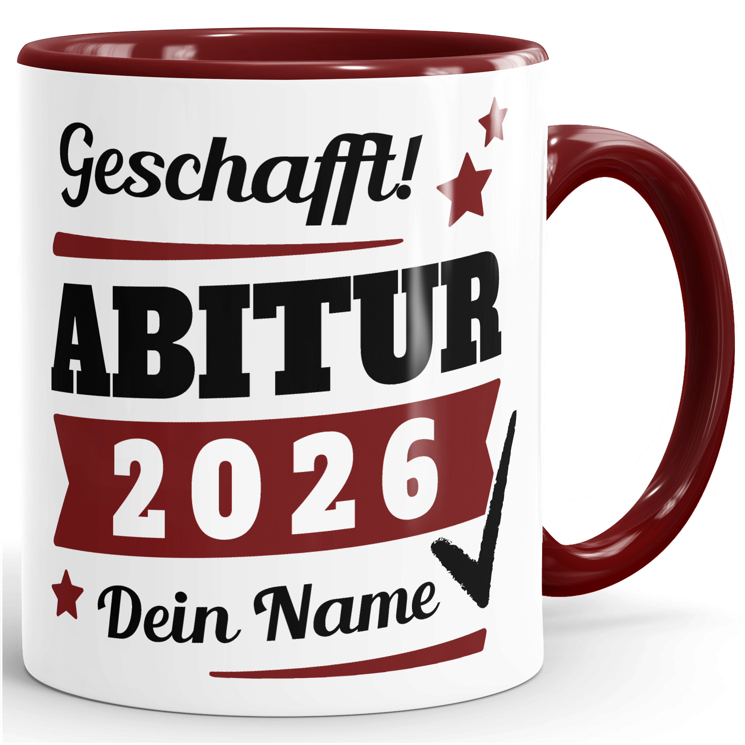 - Geschafft! Schule? ...war gestern! 2026 geht das wahre Leben los ;-) Das Abitur in der Tasche warten Studium oder Ausbildung ...oder erst einmal das süße Nichtstun! Und das perfekte Geschenk für Abiturienten gibt es hier: Eine coole Tasse mit dem eigenen Namen und dem Abschluss-Jahr wird immer an dieses besondere Ereignis erinnern