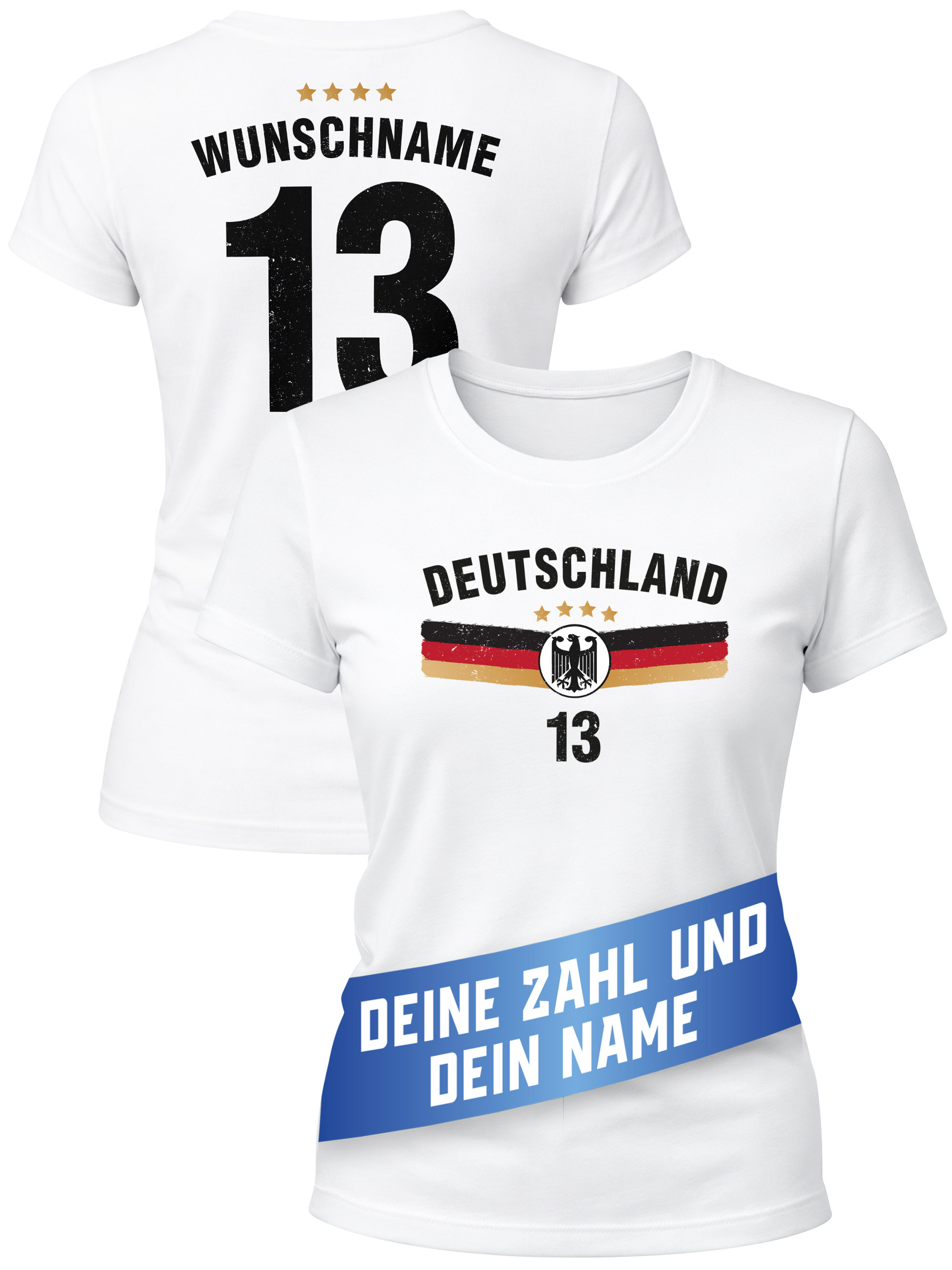 - Cooles T-Shirt für Frauen zur Fußball Weltmeisterschaft 2026. Die moderne und günstige Alternative zu klassischen Deutschland-Trikots. Personalisierbar mit dem eigenen Namen und individueller Trikot-Nummer