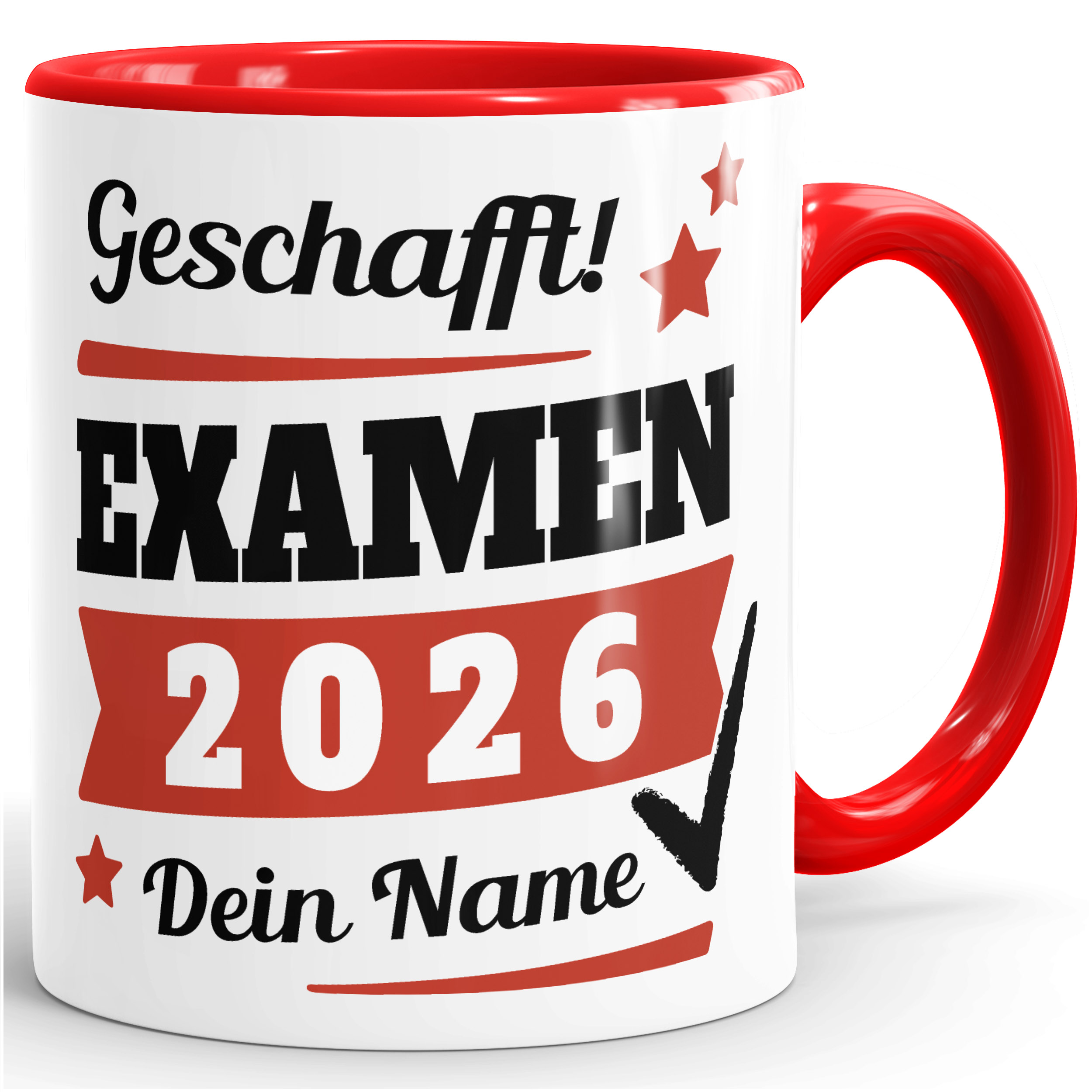 - Ein Hut als Geschenk zum bestandenen Examen war gestern! ;-) 2026 gibt es eine Abschluss-Tasse. Geschafft! Das muss gefeiert werden. Eine coole Tasse mit dem eigenen Namen und dem Abschluss-Jahr wird immer an dieses besondere Ereignis erinnern