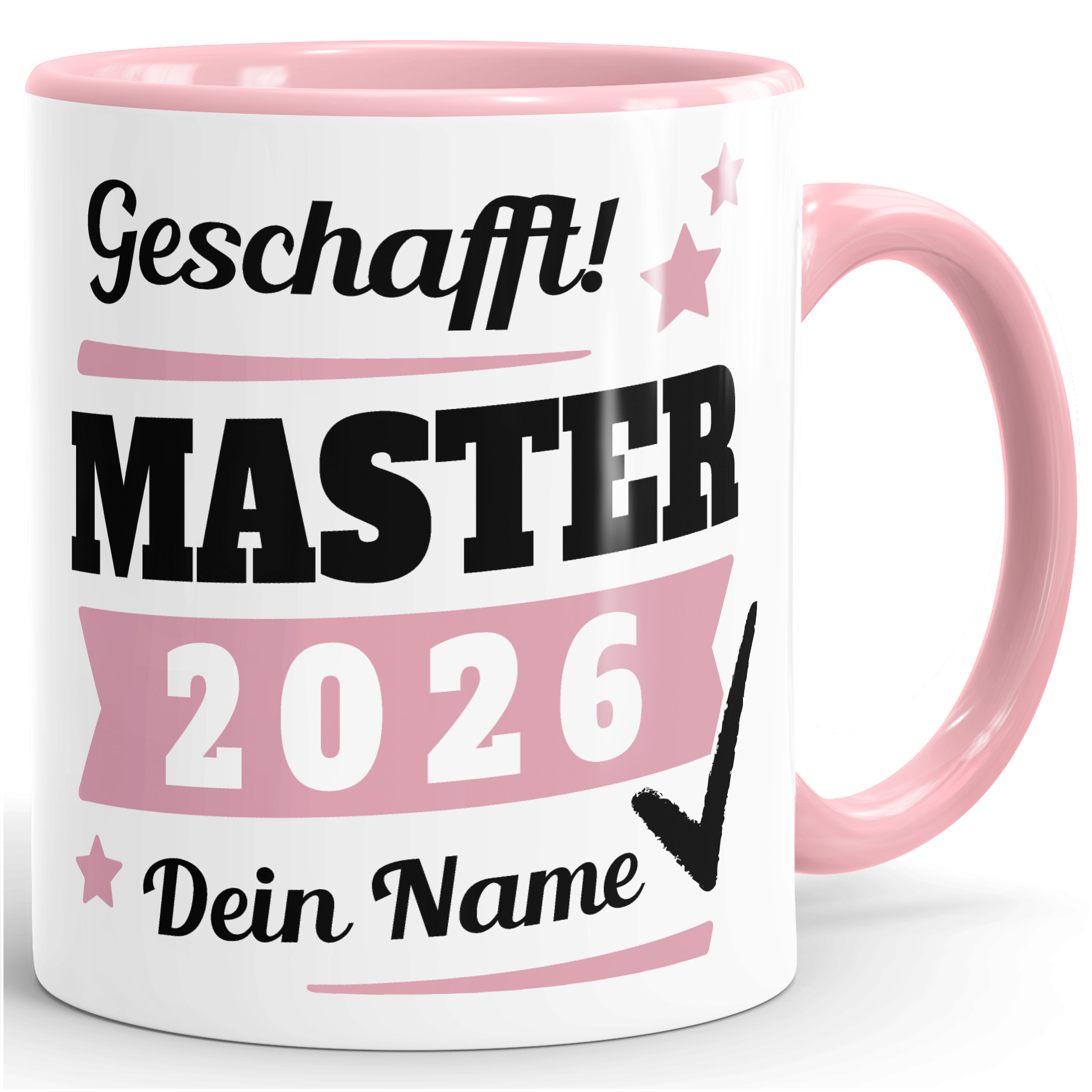 - Ein Hut als Geschenk zum bestandenen Master war gestern! ;-) 2026 gibt es eine Abschluss-Tasse zur Masterprüfung! Geschafft! Das muss gefeiert werden. Eine coole Tasse mit dem eigenen Namen und dem Abschluss-Jahr wird immer an dieses besondere Ereignis erinnern