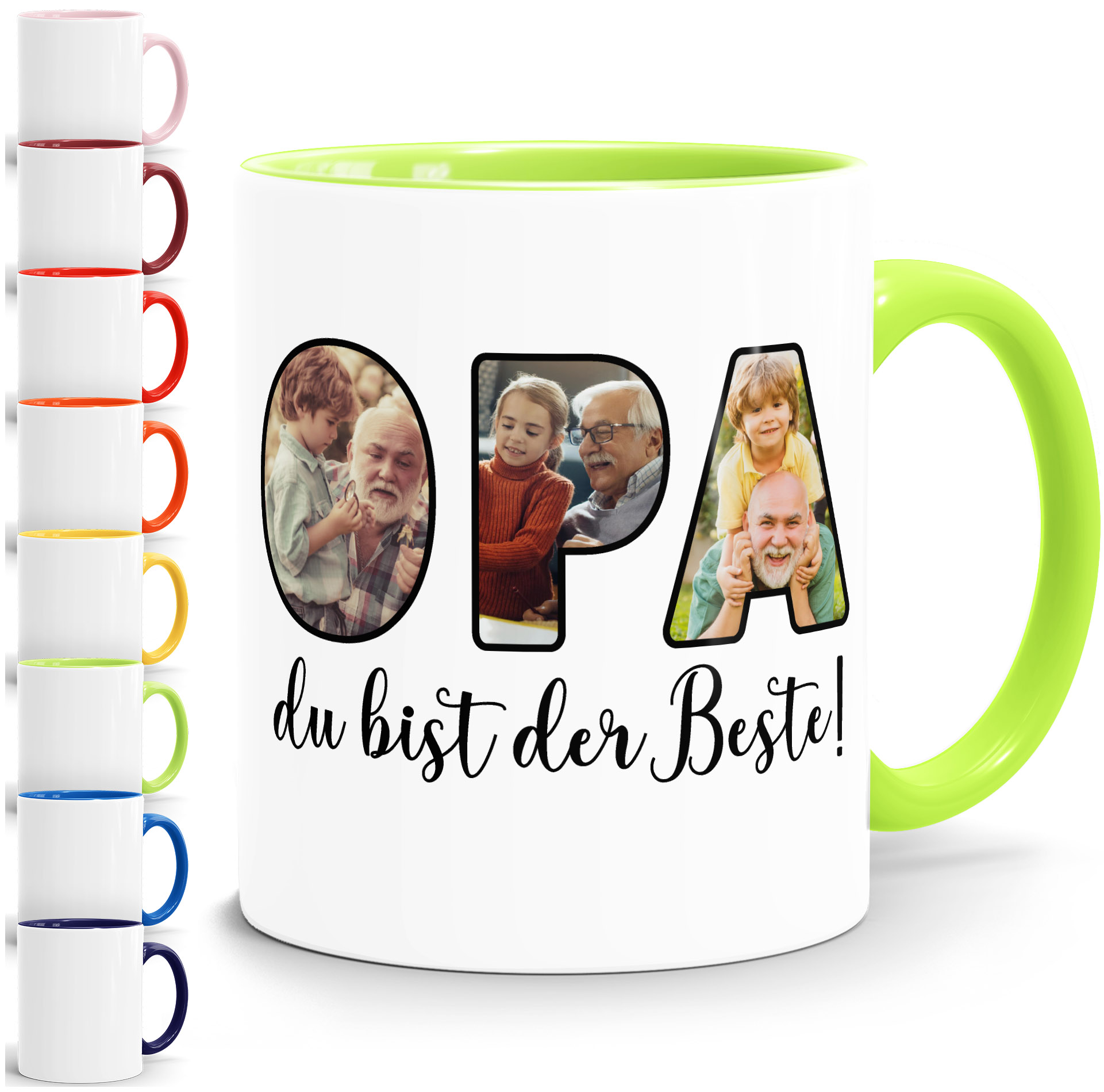 • Opa, du bist der Beste! Überrasche deinen Großvater mit einem kreativen Foto-Geschenk und kleinem Liebesbeweis. Die Kaffee-Tasse mit origineller Foto-Collage aus Buchstaben und deinen eigenen Bildern erinnert deinen Opi immer an unvergessliche gemeinsame Momente
