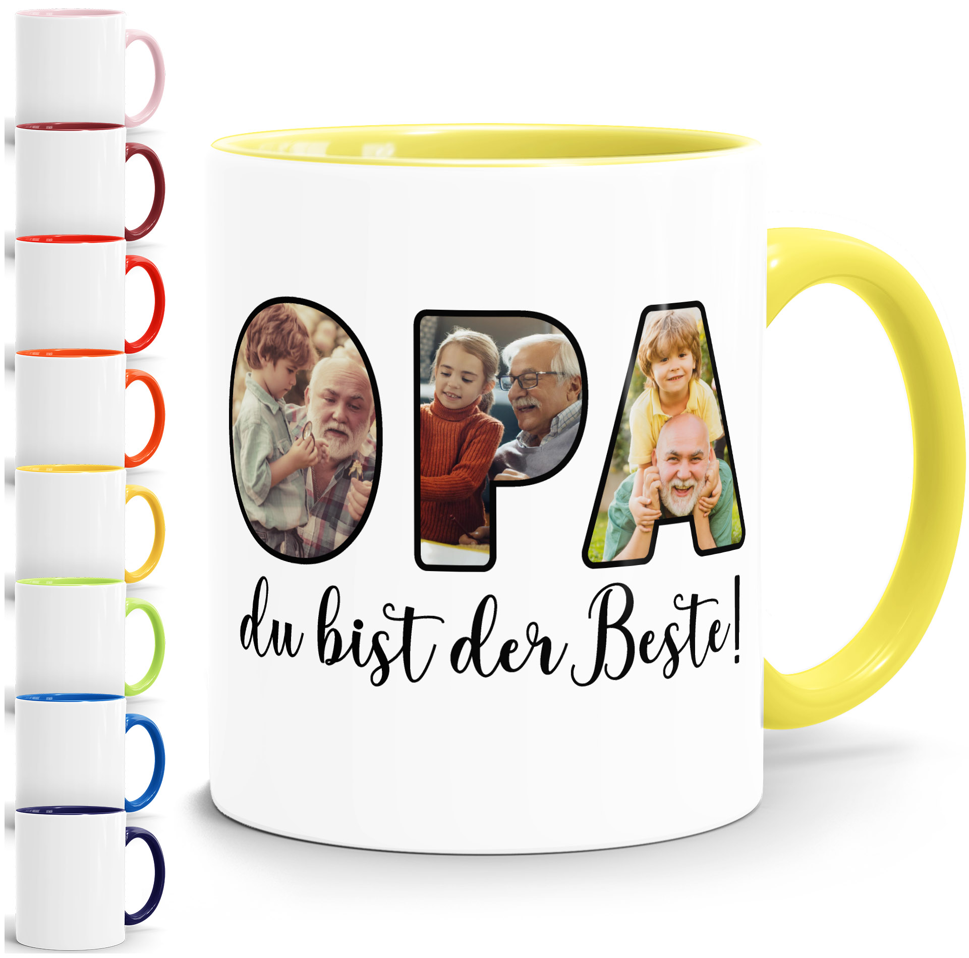 • Opa, du bist der Beste! Überrasche deinen Großvater mit einem kreativen Foto-Geschenk und kleinem Liebesbeweis. Die Kaffee-Tasse mit origineller Foto-Collage aus Buchstaben und deinen eigenen Bildern erinnert deinen Opi immer an unvergessliche gemeinsame Momente