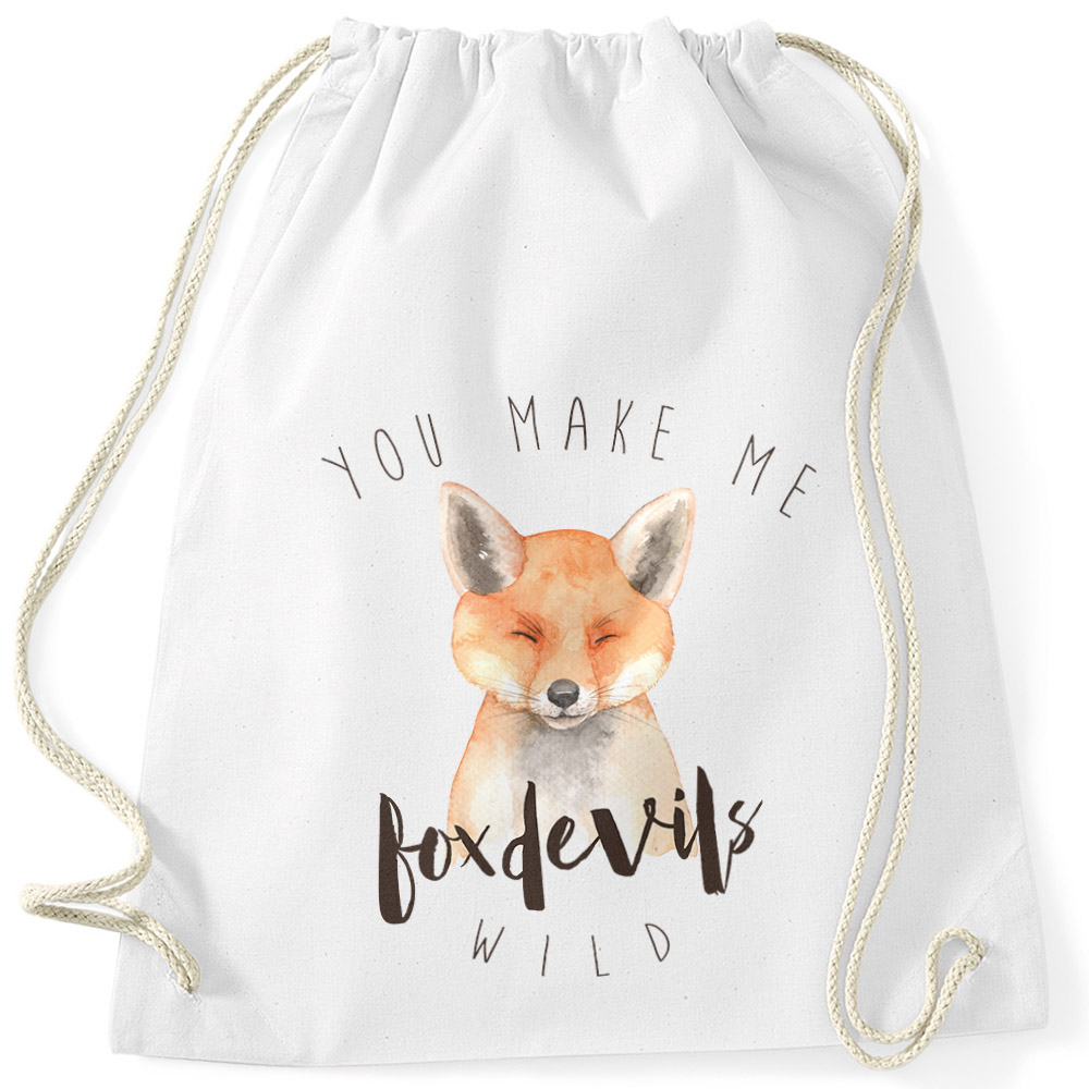 • ausgefallener Turnbeutel mit gezeichnetem Watercolor Fuchs Aufdruck und "you make me fox devils wild" Spruch der Marke Moonworks®