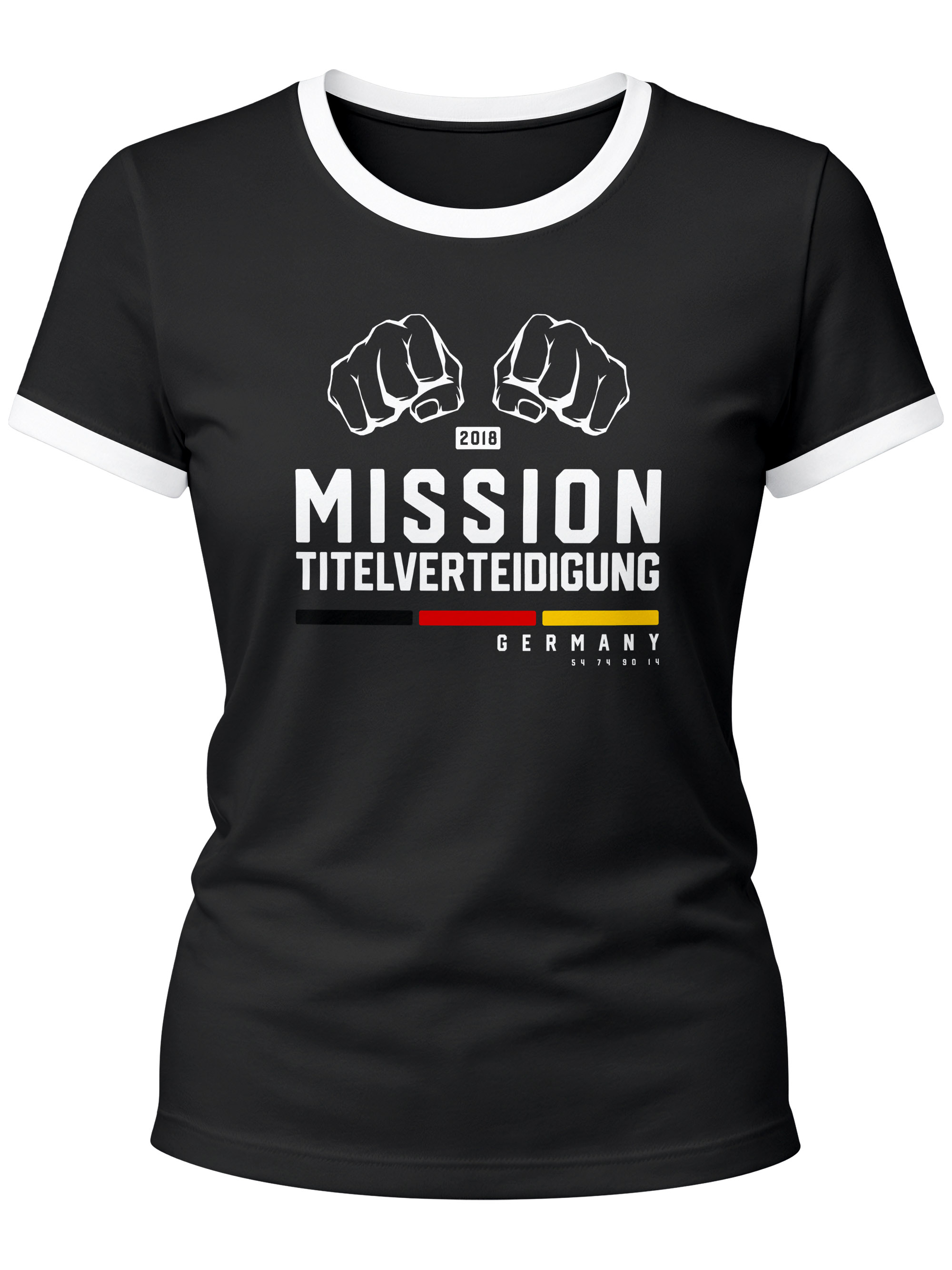 • Motiv: 2026 Mission Titelverteidigung Schwarz Rot Gold Fäuste Faust WM-Siege 54 74 90 14