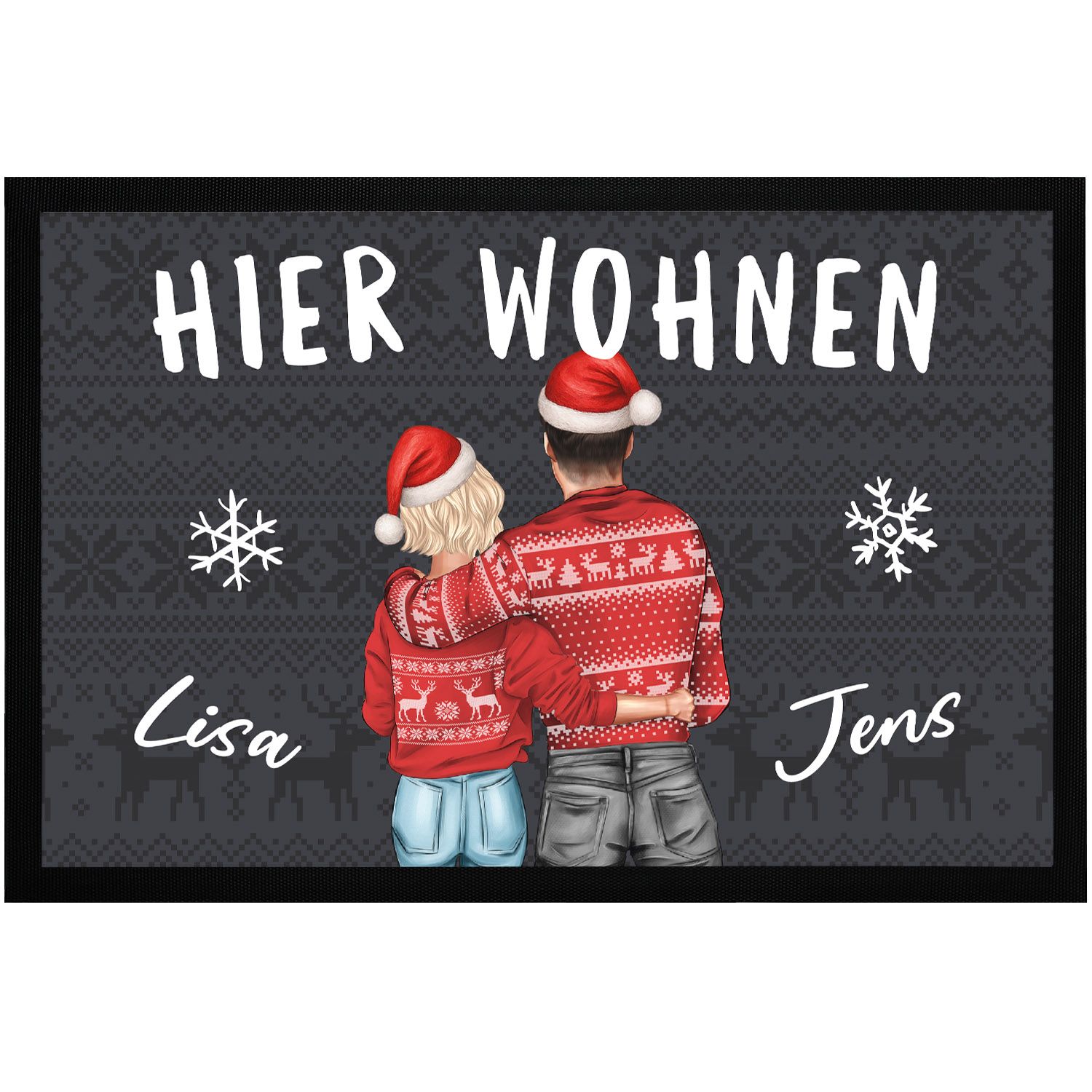 - Einfach online Türmatte selbst gestalten mit vielen individuellen Anpassungsmöglichkeiten - Gestalte euer Pärchenbild nach deinen Vorstellungen. Wähle Haarfarbe, Frisur und Farbe des Weihnachtspullovers und passe eure Namen an