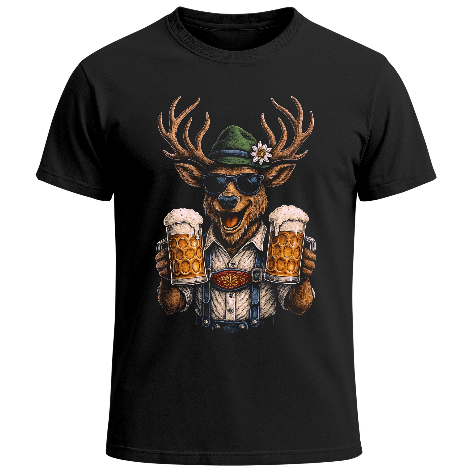 - Motiv: Hirsch im Trachtenlook, Trachtenhut, Edelweiß, Sonnenbrille und zwei Maßkrüge Bier Motiv