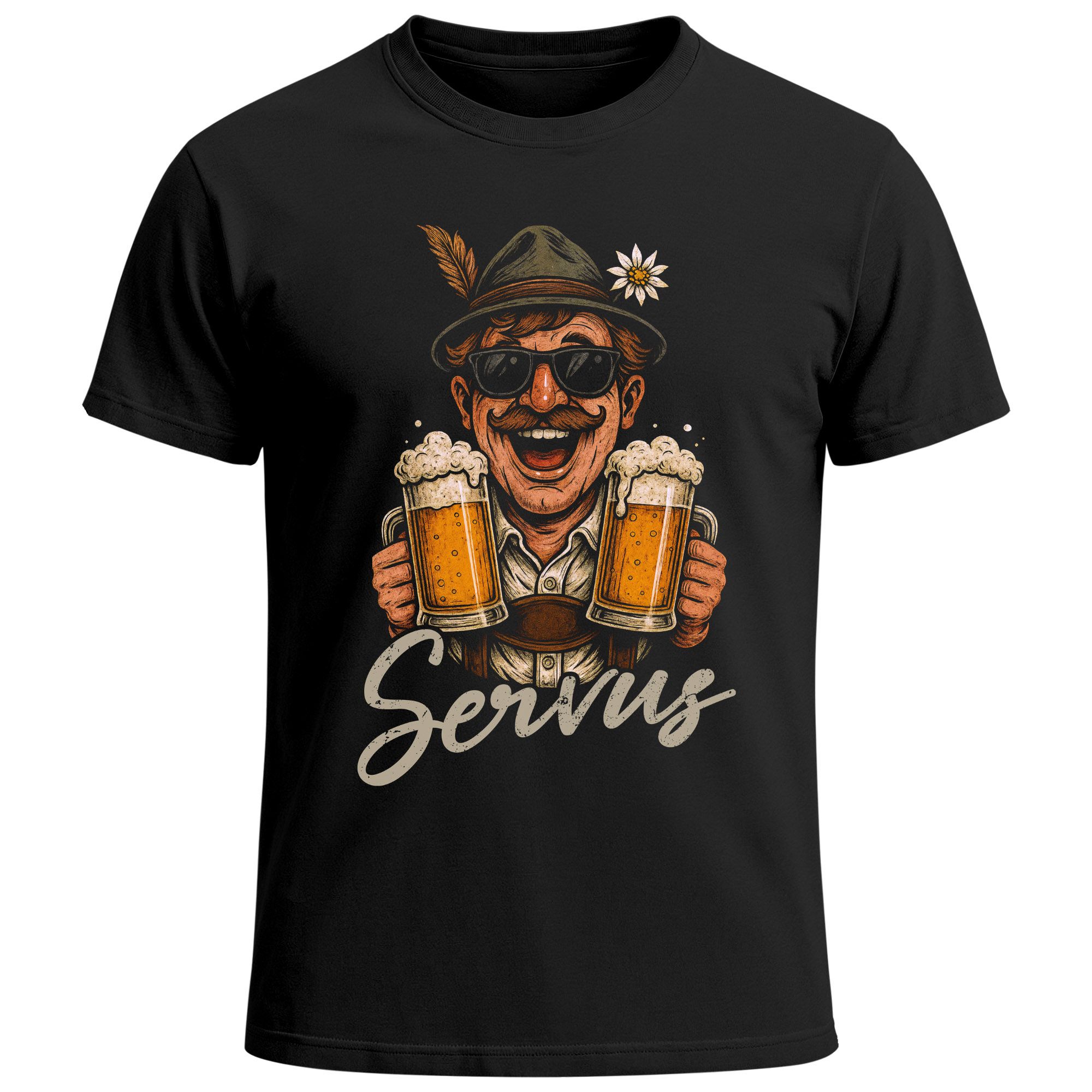 - Zünftiger Wiesn-Humor: Lustiges Trachtenshirt mit Schriftzug "Servus" und Bayer im Trachtenlook mit zwei Maß Bier Motiv – inspiriert vom Flair großer Volksfeste. Perfekt als Saufshirt für Männer mit Humor und dein witziges Outfit für das Oktoberfest.