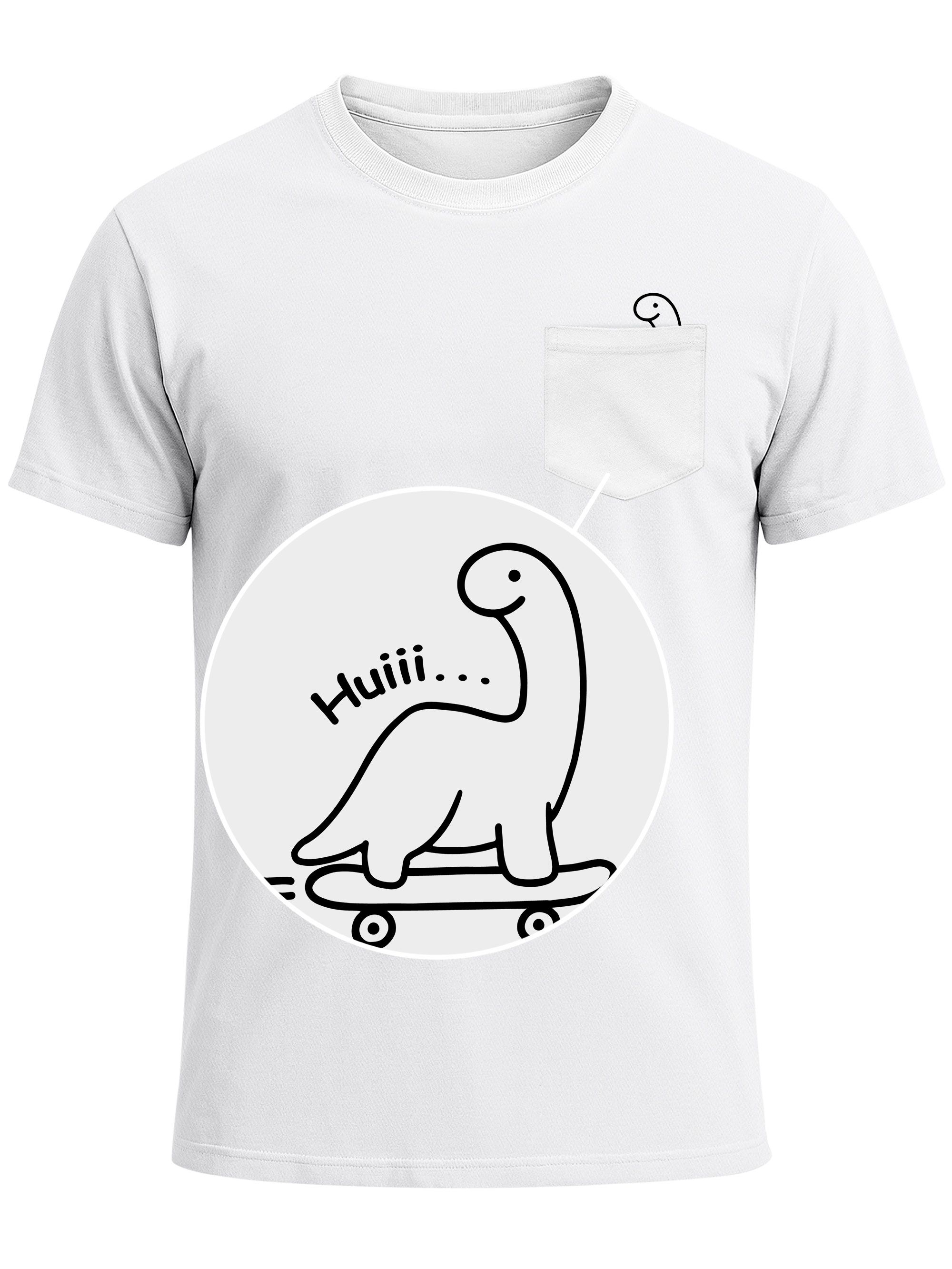 - Lustiges T-Shirt mit Brusttasche: Achtung, Taschenmonster! Aber ein sehr Niedliches! Dieser Skater-Dino schaut neugierig aus der Tasche und sorgt garantiert für Gesprächsstoff. Ein cooles Design mit Aha-Effekt – und tierisch witzigem Taschen-Insider