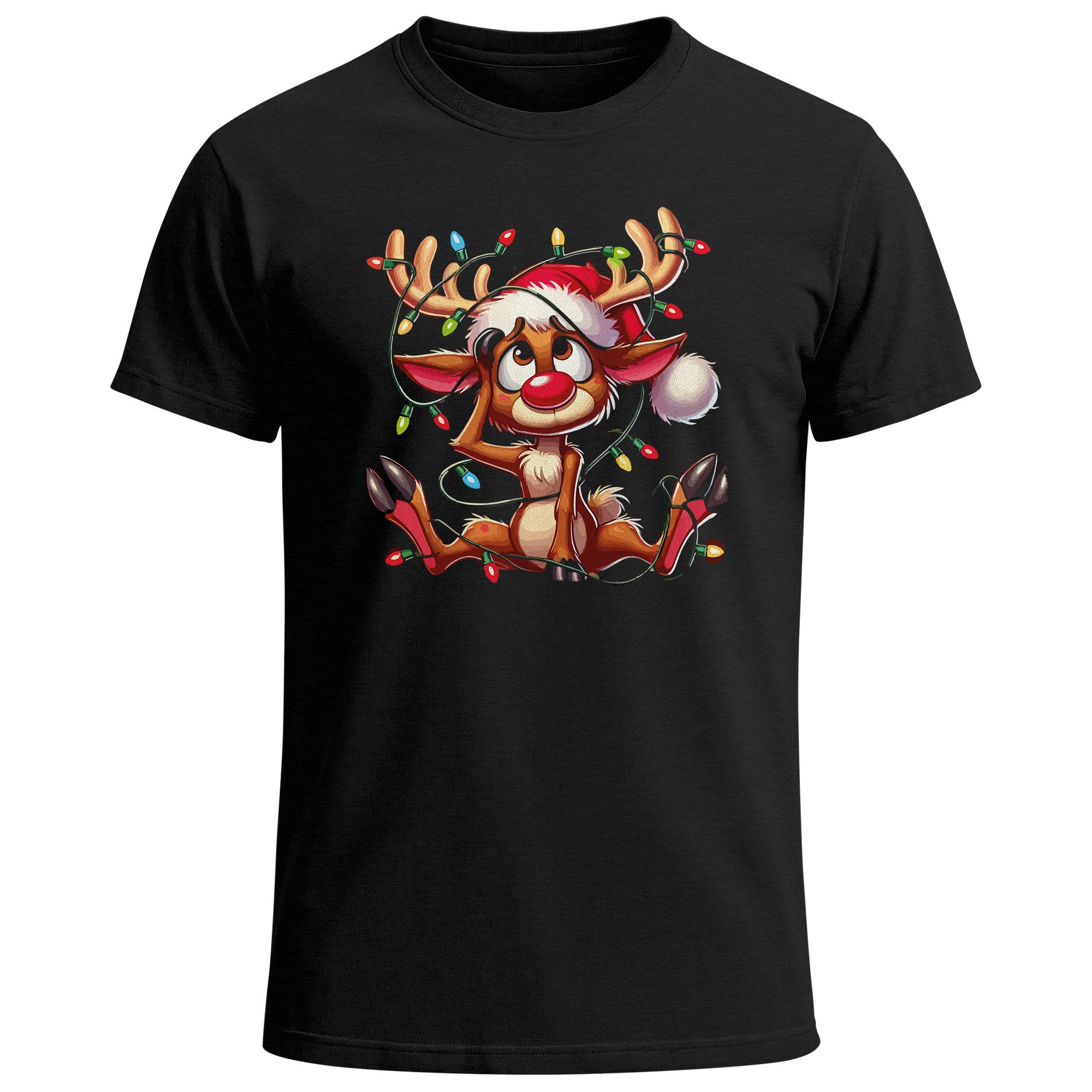- Unser fröhliches Rentier, das sich in einer Lichterkette verheddert hat, sorgt für jede Menge Lacher und Weihnachtsstimmung. Das perfekte Weihnachtsoutfit für alle, die die festliche Jahreszeit mit einem humorvollen und charmanten Look genießen möchten