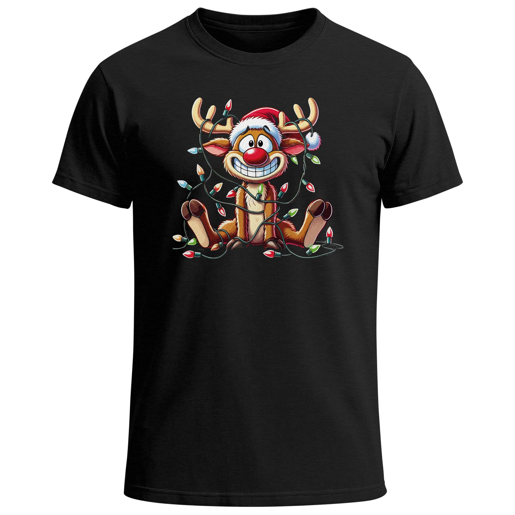 - Ideal für Weihnachtsfeiern, als lässiges Outfit für die Adventszeit oder als originelle Geschenkidee für Rentier- und Weihnachtsfans. Dieses T-Shirt zeigt ein fröhliches Rentier, das sich in einer Lichterkette verheddert hat, und sorgt für jede Menge Lacher und Weihnachtsstimmung.