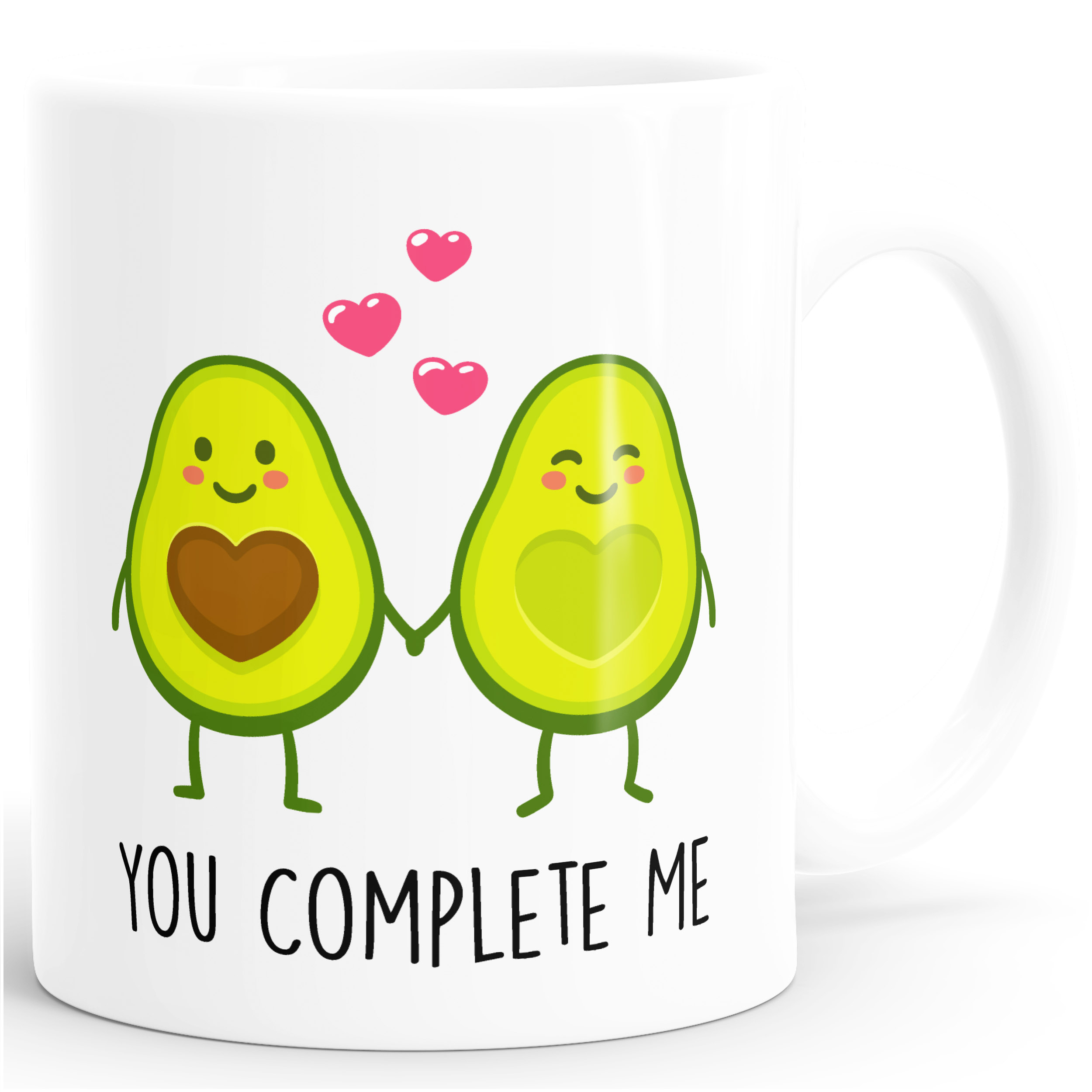 - das perfekte Geschenk für deine besser Hälfte: liebevolle Geschenk-Tasse mit zwei verliebten Avocado-Hälften und "you complete me" Schriftzug der Marke MoonWorks®