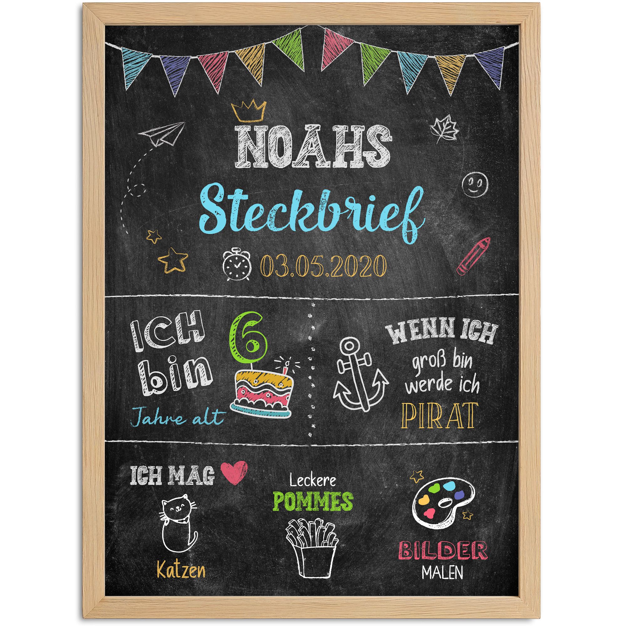 - Personalisierter Kindersteckbrief zum Staunen & Erinnern: Name, Alter, Vorlieben, Berufswunsch – all das findet auf diesem liebevoll gestalteten Poster seinen Platz. Gestalte das individuelle Poster im Schultafel-Design unter "Jetzt anpassen" und überrasche dein Kind mit einem einzigartigen Wandbild fürs Kinderzimmer