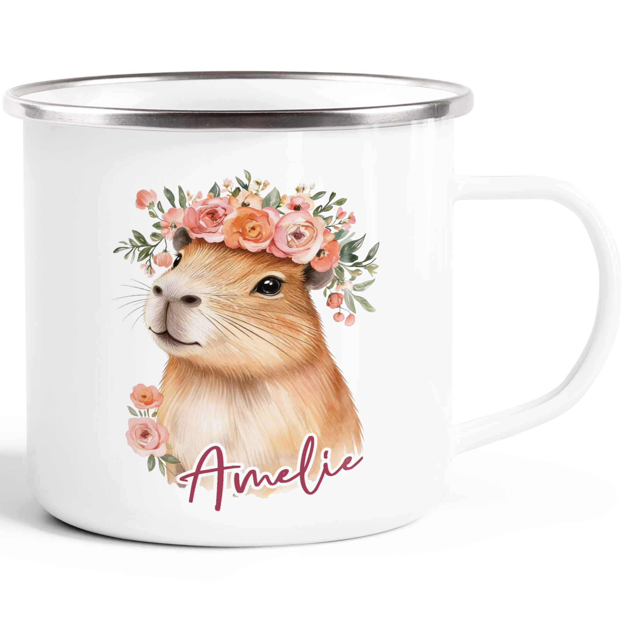 - Personalisierte Namenstasse aus Emaille mit süßem Capybara-Motiv und Wunschname. Sie punktet bei Mädchen und Jungen, die Tiere und vor allem dieses besondere Nagetier lieben. Ideal als Kinderbecher, Namenstasse für Kinder oder liebevolles Accessoire für den Alltag