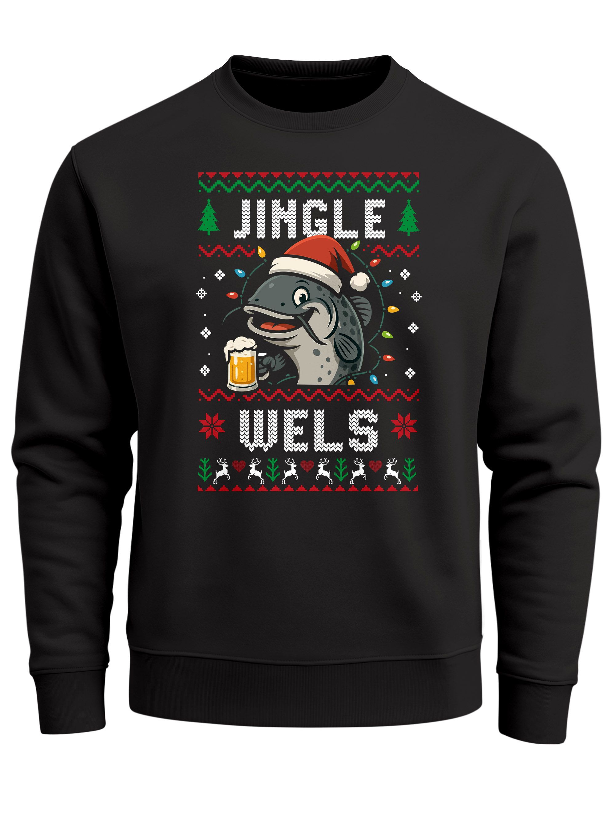 - Witziger Ugly Christmas Sweater „Jingle Wels“ – perfekt für Weihnachtsfeiern, Angler und Humor-Fans mit Sinn für Wortwitz. Lustiges Design mit Weihnachtsmütze und Bier sorgt für festliche Stimmung mit Spaßfaktor