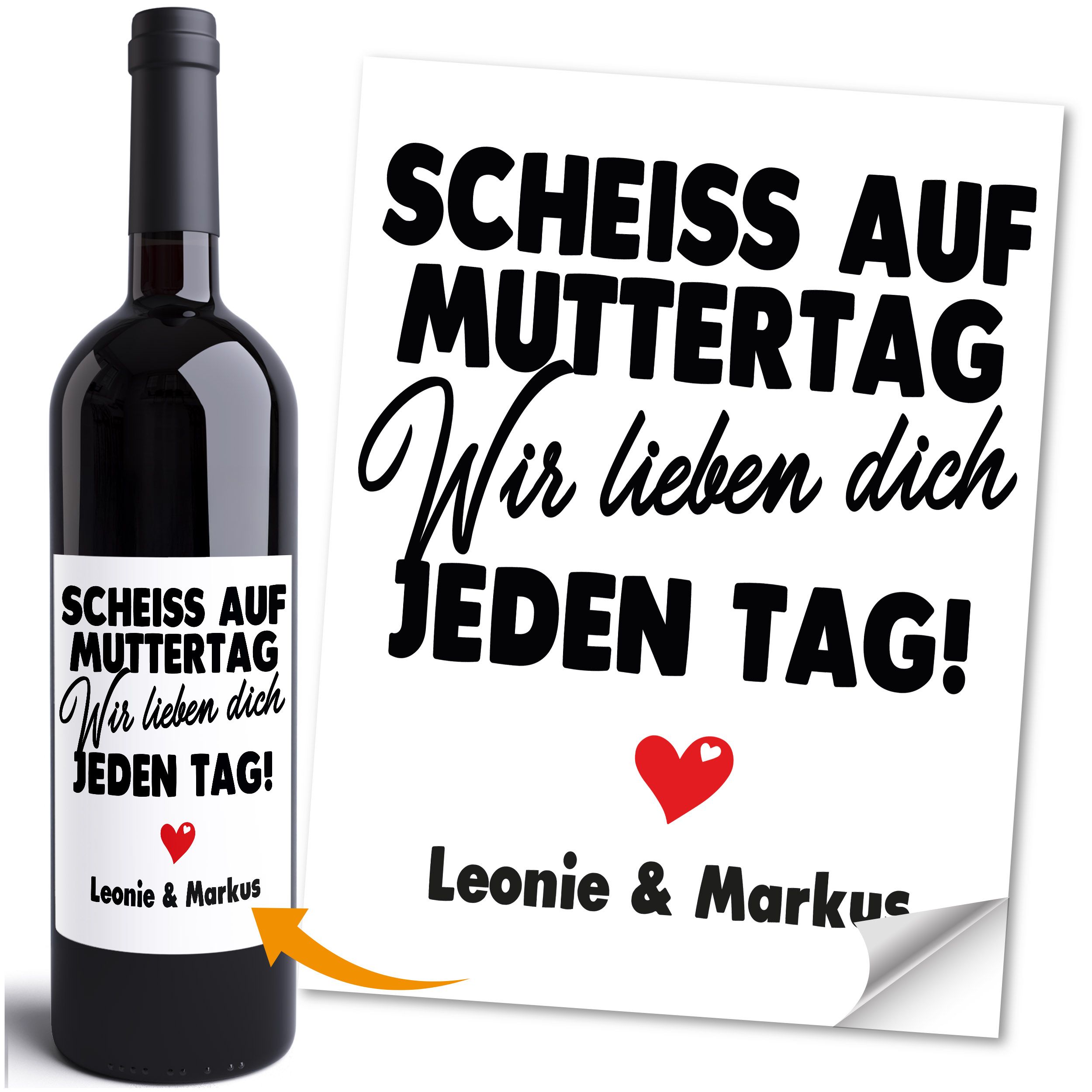- Bring deine Lieblingsmama zum Lachen mit einer individuell gestalteten Weinflasche. Mit lustigem Spruch "Scheiß auf Muttertag, wir lieben dich jeden Tag" und ganz einfach online anpassbar mit deinen Wunschnamen